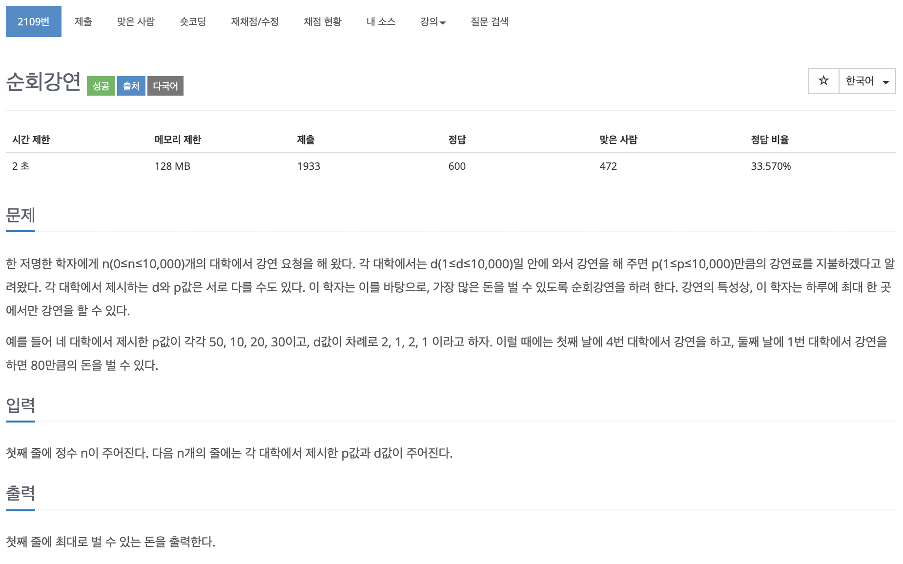 오늘 설명할 문제는 백준 2109번 순회 강연이다.
