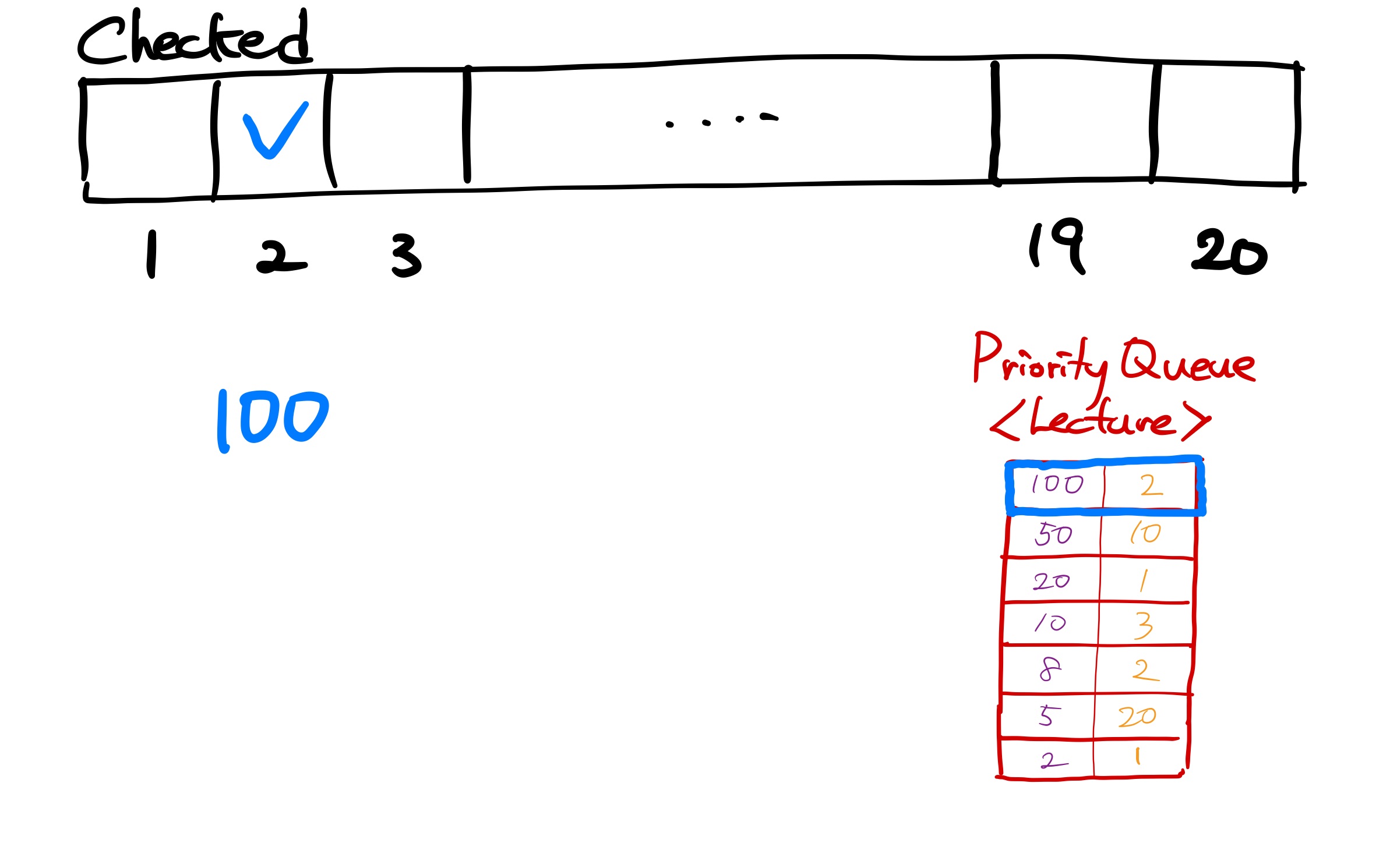 이제 PriortyQueue에서 하나씩 꺼내준다. 먼저 첫 번째 강연이다. 강연료는 100이고 날짜 제한은 2일까지이다. 그러면 2일째부터 역순으로(2일 -> 1일) checked 배열을 체크한다. 2일에 아직 강연이 없으므로 2일에 이 강연을 넣고, checked[2] = true 로 바꾸어 준다. 현재까지 강연료 합계는 100이다.