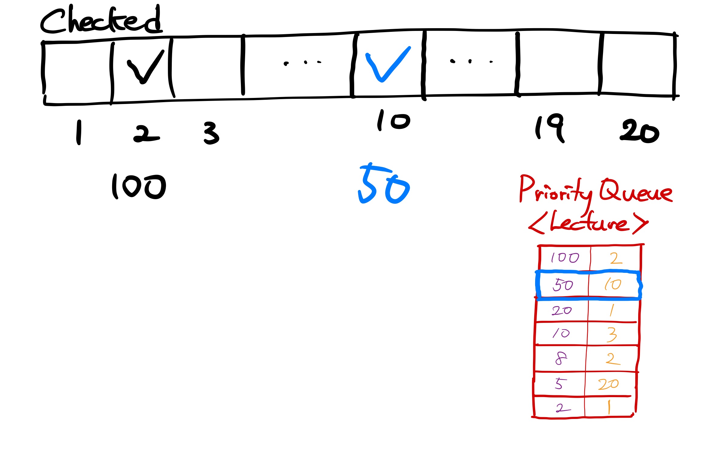 두 번째 강연을 꺼내본다. 두 번째 강연은 강연료 50에 날짜 제한이 10일이다. 마찬가지로 10일부터 역순으로 체크를 하면서 비어있는 날짜에 바로 강연을 넣는다. 10일이 비어있으므로 여기에 두 번째 강연을 넣고 checked[10] = true로 바꾸어 준다. 현재까지 강연료 합은 150이다.