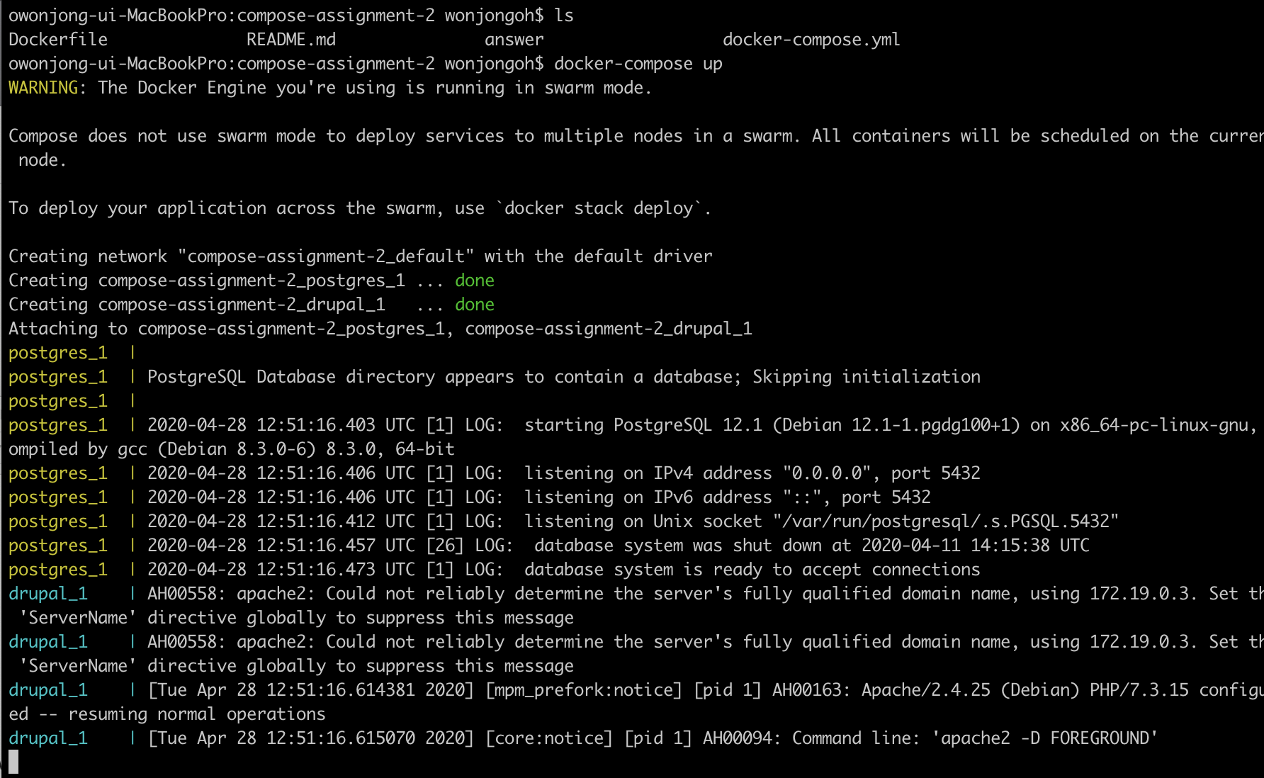 postgres 서비스의 경우 drupal-data 볼륨을 추가해 주었는데, 그 이유는 도커 컴포즈가 재시작 하더라도 데이터를 보호해 주기 위함이다. 지난 포스팅 참고