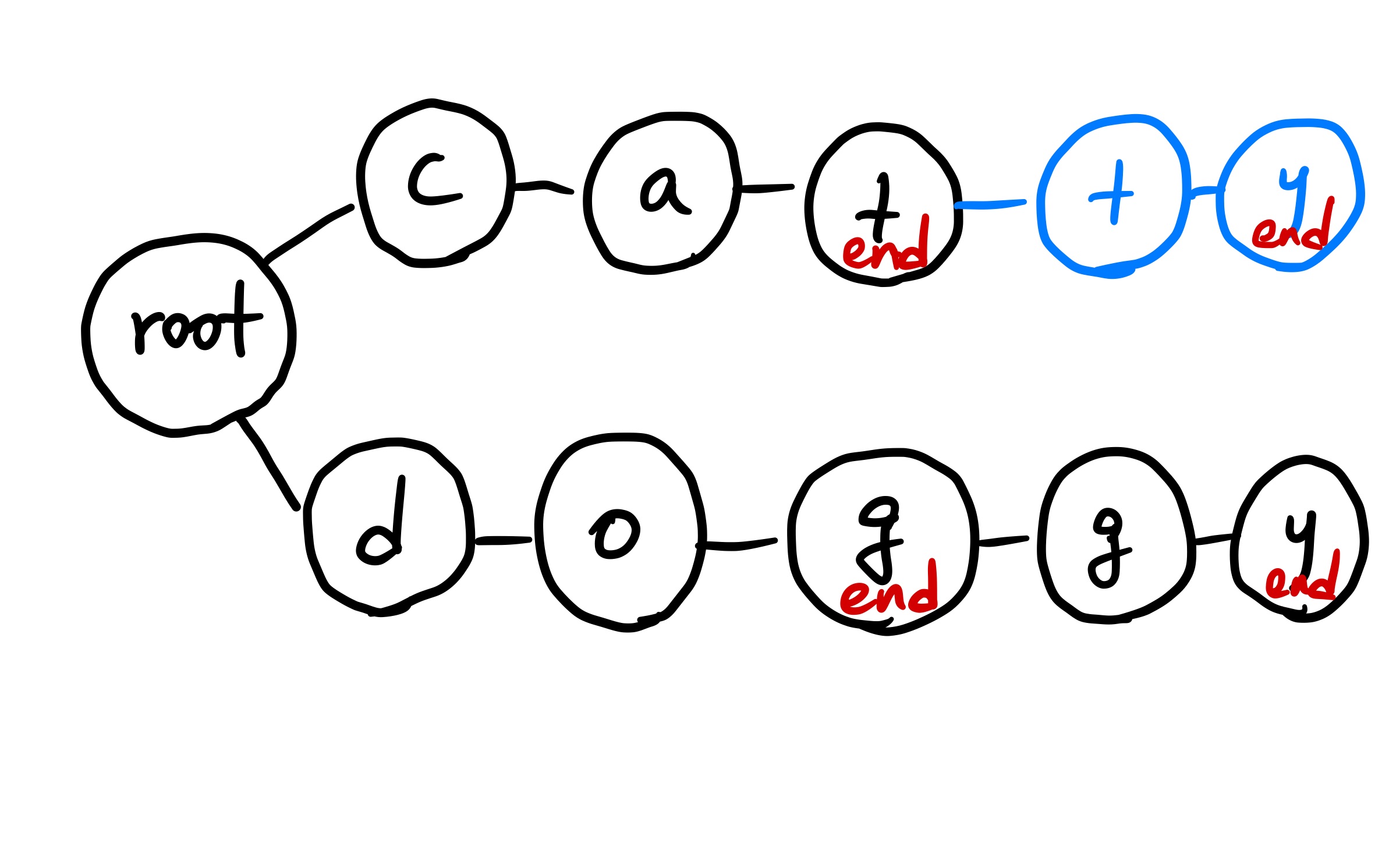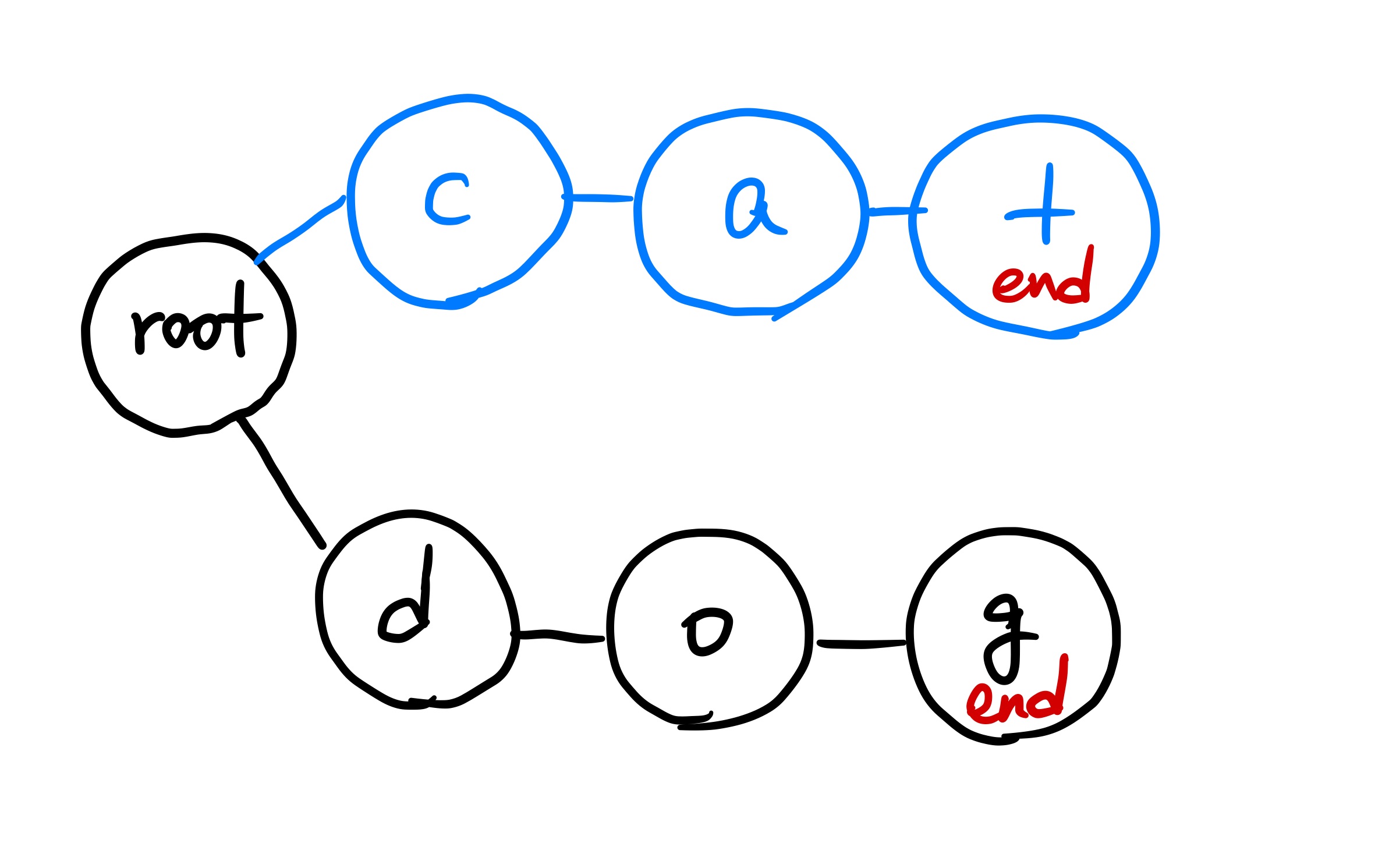 N,M이 큰 경우 이러한 방식은 시간이 굉장히 오래 걸린다. 그래서 우리는 트라이를 사용하여 O(M)으로 특정 문자열을 찾는 방법을 알아본다. 문자열 { "dog", "cat", "doggy", "catty", "cate" } 이 있다고 생각해 보자. 처음에 root Node를 설정하고 문자열을 하나씩 받는데, 각각의 문자열을 하나의 문자씩 쪼개서 트리 형태로 저장한다.