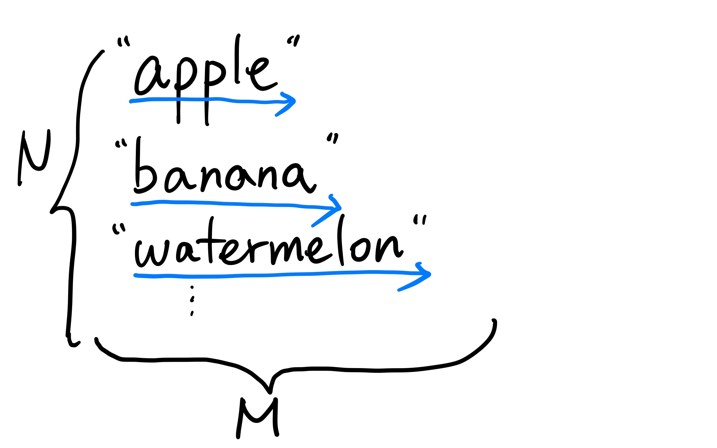 길이가 M 이하인 문자열 N개가 있다고 생각해 보자. 이 문자열 중에서 특정 문자열이 있는지를 찾으려면 시간이 얼마나 걸릴까? 아래처럼 문자열을 처음부터 하나씩 순차적으로 탐색을 하면 O(M*N)이 걸릴 것이다.