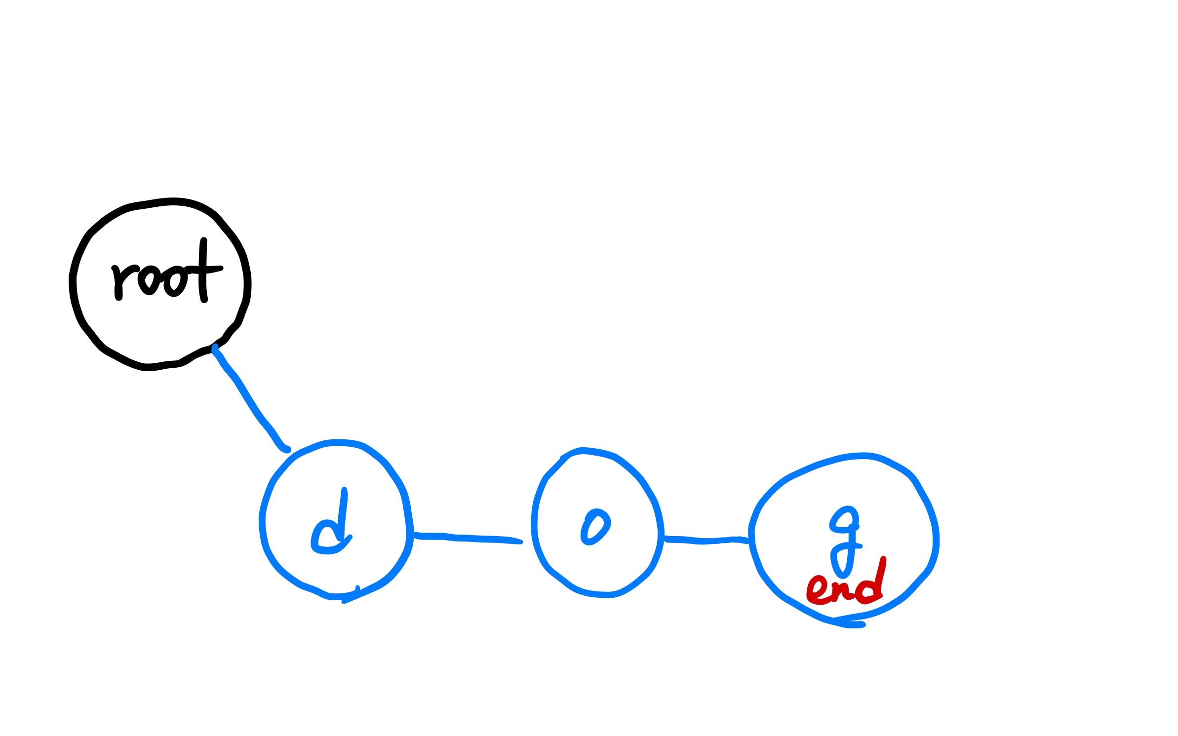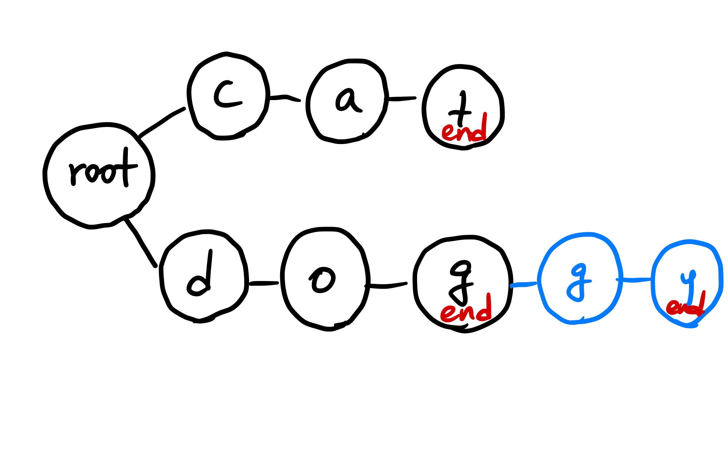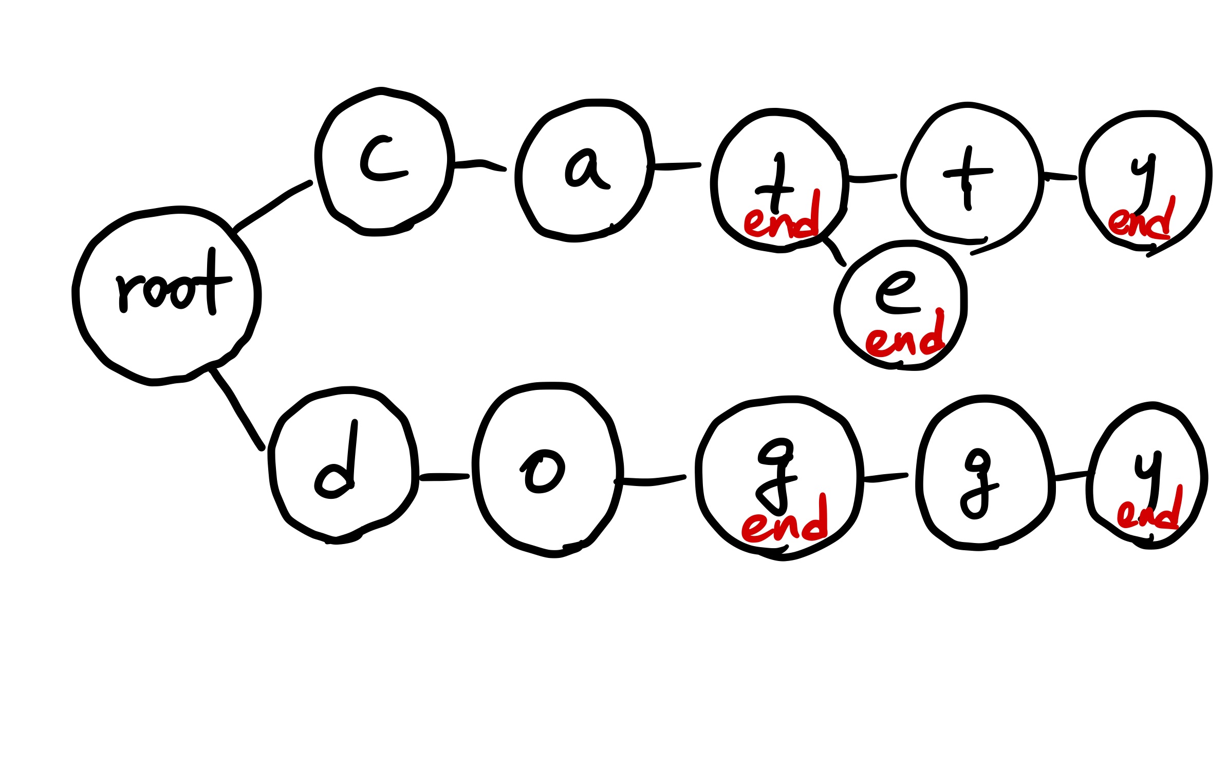 N,M이 큰 경우 이러한 방식은 시간이 굉장히 오래 걸린다. 그래서 우리는 트라이를 사용하여 O(M)으로 특정 문자열을 찾는 방법을 알아본다. 문자열 { "dog", "cat", "doggy", "catty", "cate" } 이 있다고 생각해 보자. 처음에 root Node를 설정하고 문자열을 하나씩 받는데, 각각의 문자열을 하나의 문자씩 쪼개서 트리 형태로 저장한다.