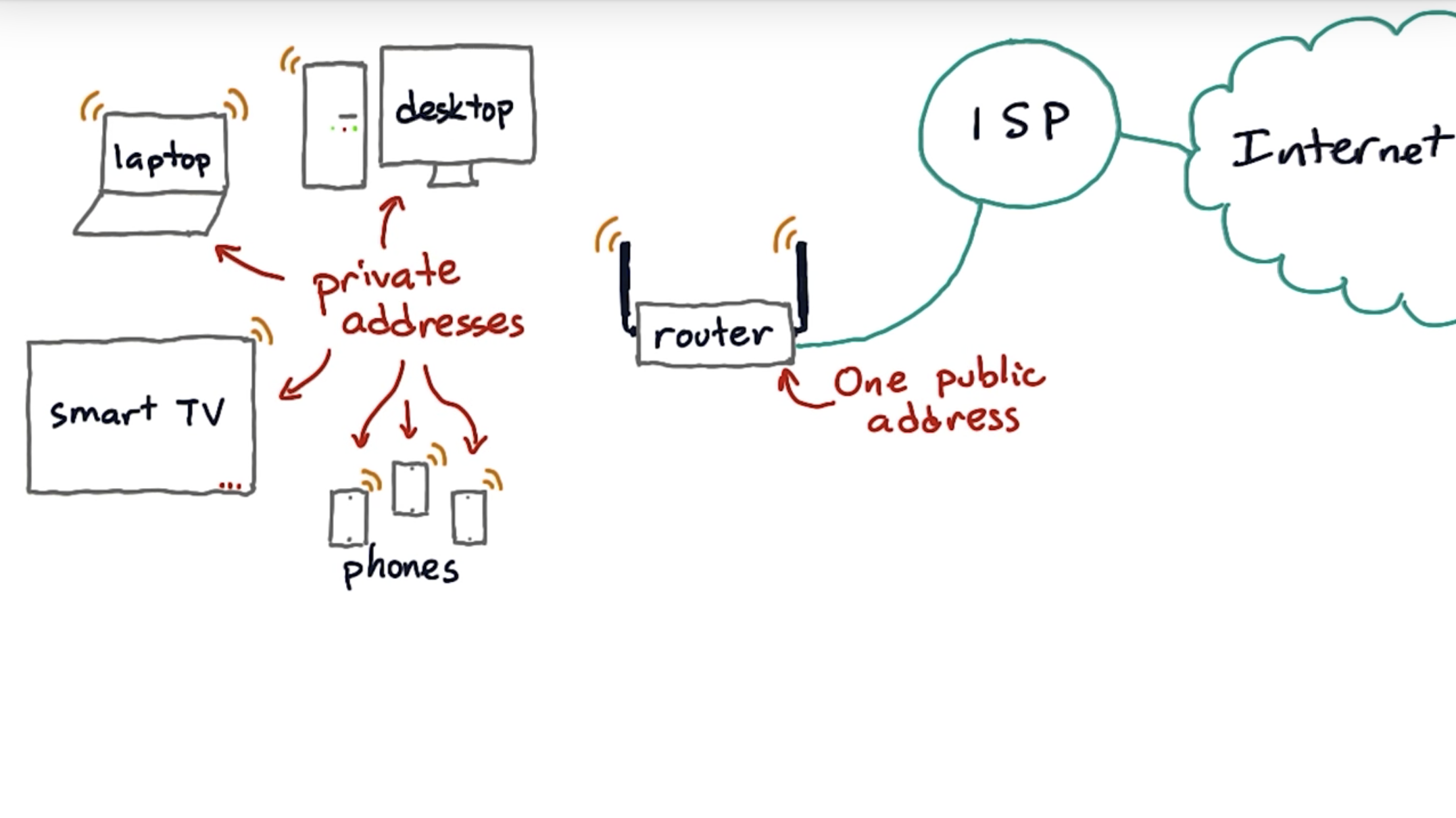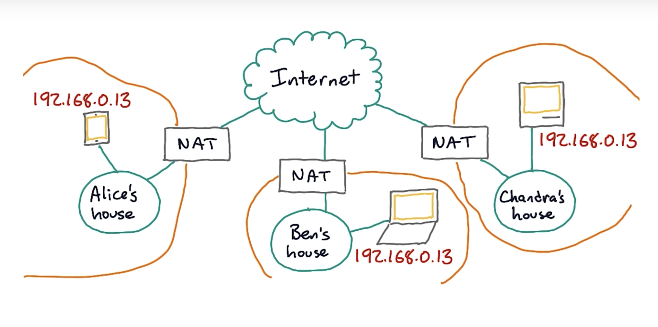 인터넷이 라우터에게 하나의 public address 를 전달하면 그 라우터에 연결된 기기들은 private address를 사용한다. private address는 유일한 값이 아니어서(전 세계에 하나만 있는 그런 unique), 인터넷에 직접 접근할 수는 없다.