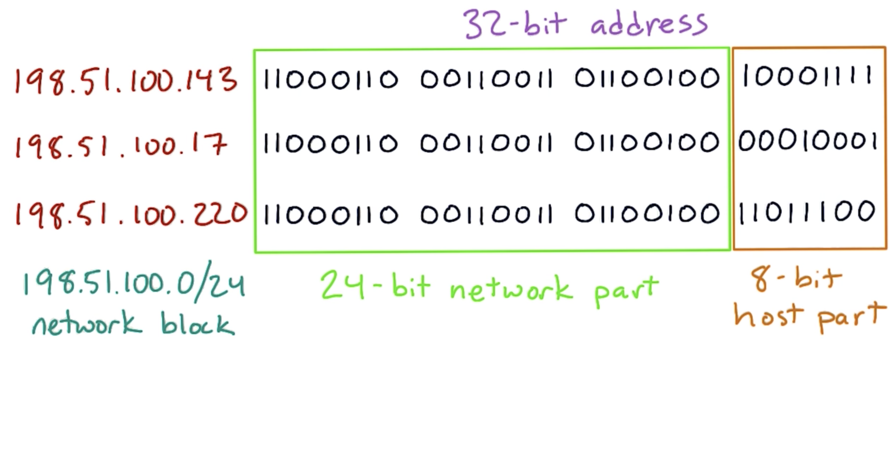 우리가 근거리 네트워크에서 사용하는 IP 주소를 보면 모든 주소가 다 다른 것이 아니라 일부분만 다르다. 이에 대해서 조금 더 자세하게 알아보면 아래의 그림에서 네트워크 32bit 주소는 네트워크 파트와 호스트 파트로 나누어져 있다는 것을 알 수 있다. 예를 들어 네트워크 파트가 24bit이면, 호스트 파트는 8bit 인 것이다. 여기서 /24를 netblock 이라고 한다.