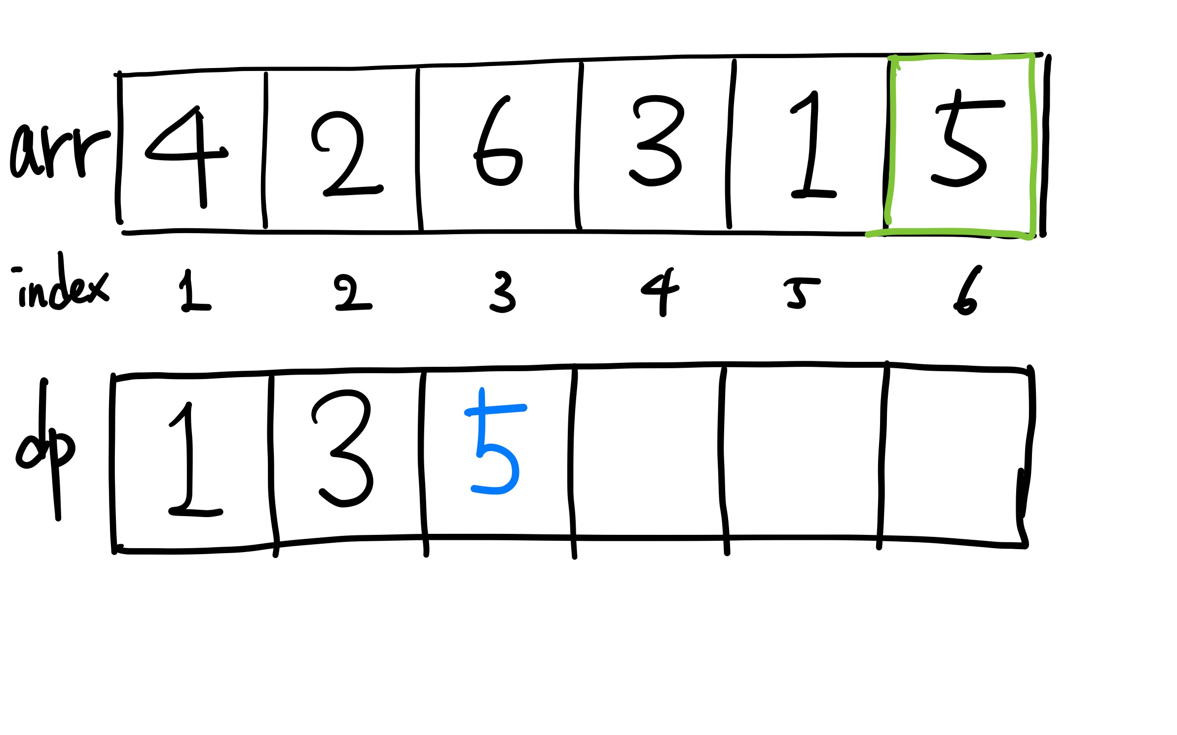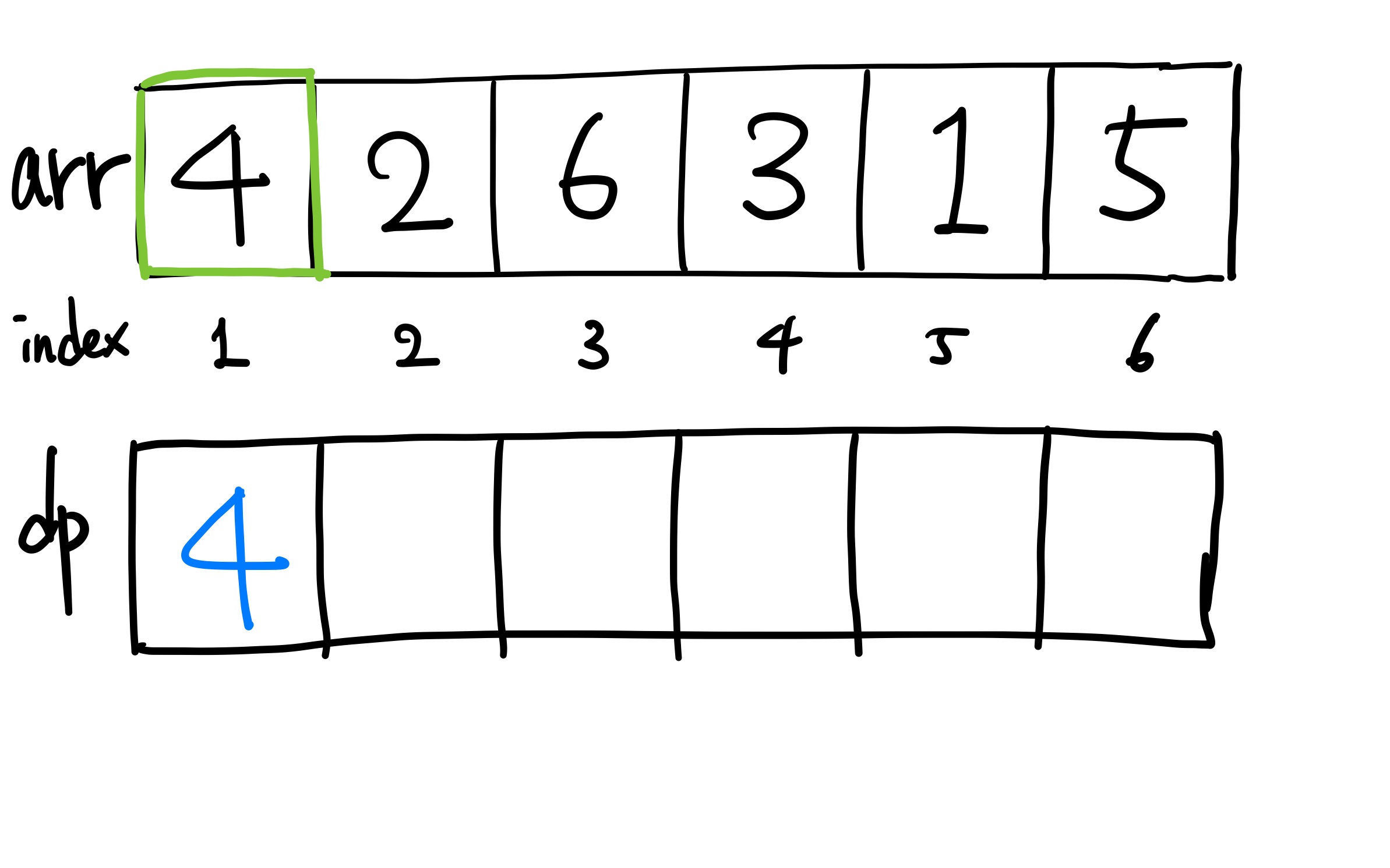 arr[1] = 4 이고, 증가 수열은 4 하나 이므로 이 값을 dp[1]에 넣어준다.