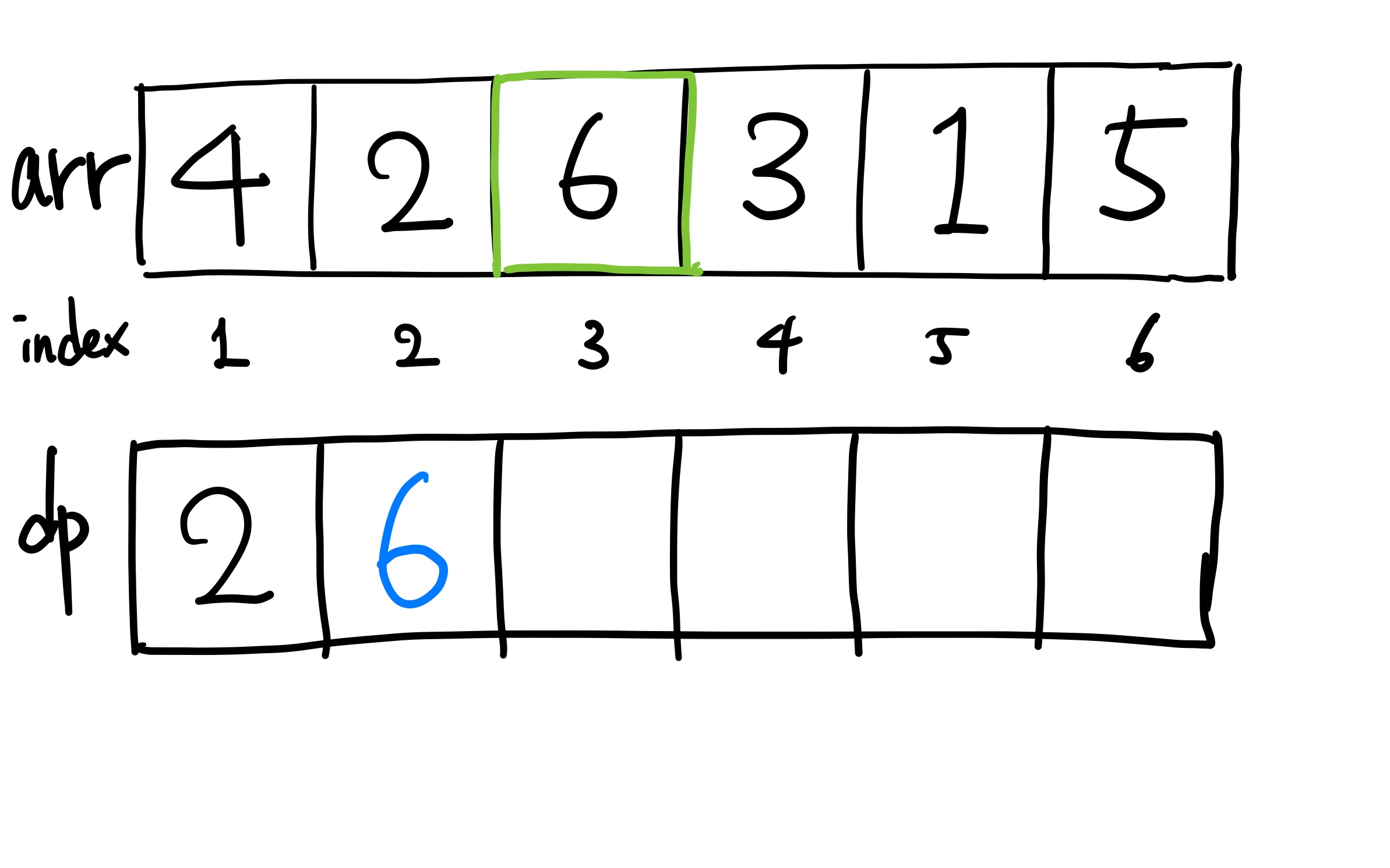3번째 값까지 탐색을 하면 4 6(또는 2 6)이라는 길이가 2인 증가 수열이 나타나게 된다. 따라서 dp[2] = 6으로 값을 업데이트 해 준다.
