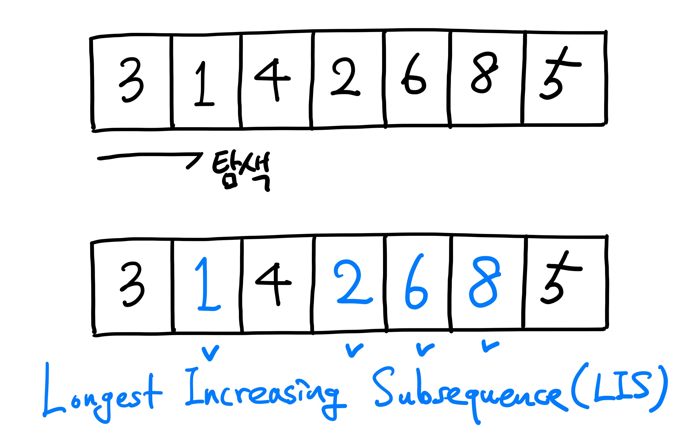 난이도는 그렇게 어렵지 않았다.(골드 3) 이 문제는 LIS(최장 증가 수열)와 DP로 풀 수 있는 문제이다. 먼저 LIS에 대해서 간단하게 설명을 해 보려고 한다. LIS는 어떤 수열이 주어졌을 때 그 수열의 부분 수열 중에서 가장 길이가 긴 수열을 의미한다. 여러가지 방법으로 이 수열을 구할 수 있겠지만, 가장 일반적인 방법은 dp를 사용하여 순차적으로 탐색을 하면서 dp 배열에 길이를 index로 넣어서 계산하는 O(N^2)의 방법이다. 자세한 방법은 아래 문제 설명을 하면서 소개하려고 한다.