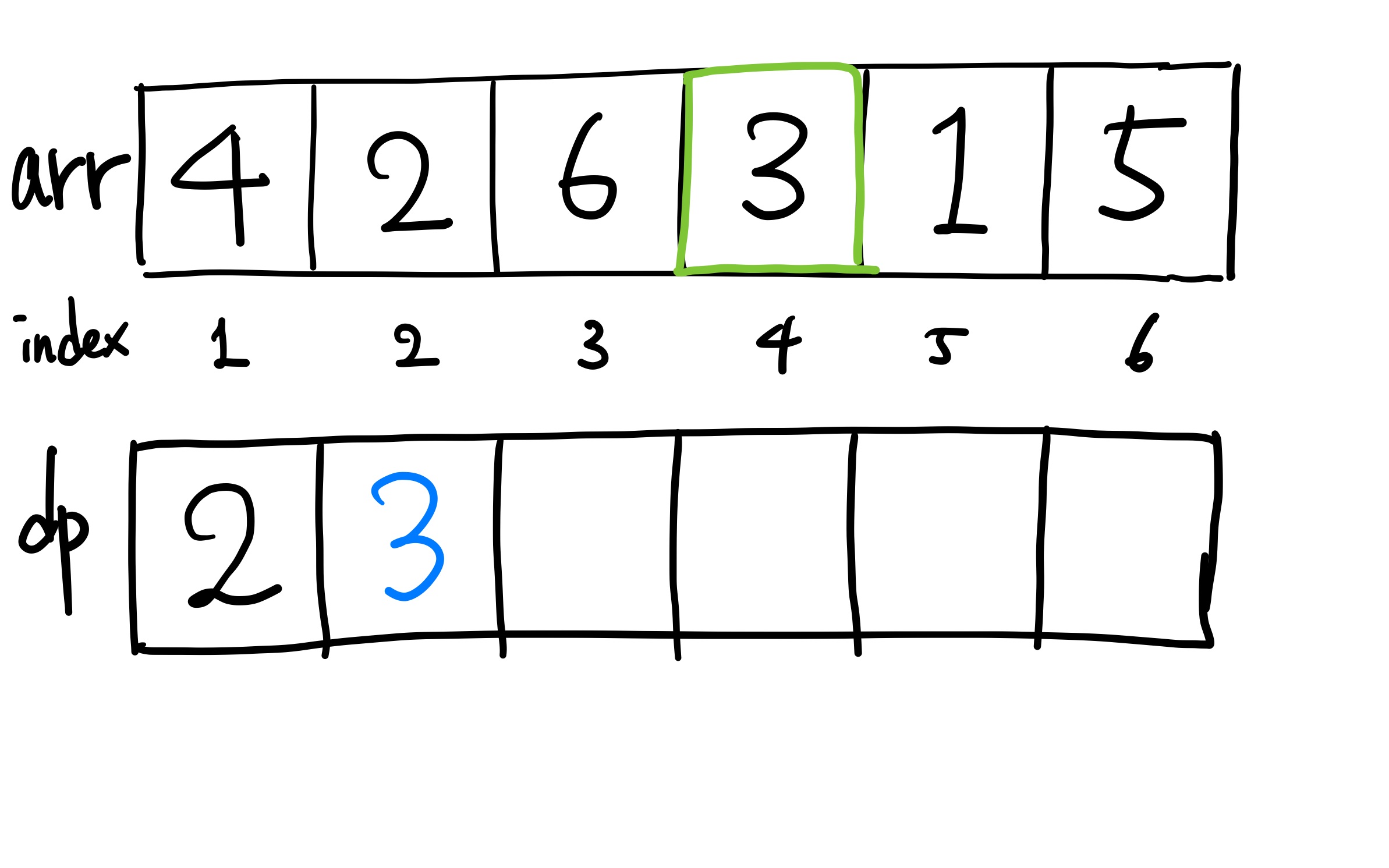 arr[2] = 2인데, 증가 수열의 길이는 아직까지 1이 최대값이지만, 2는 4보다 작으므로 dp[1] = 2로 업데이트를 해준다.