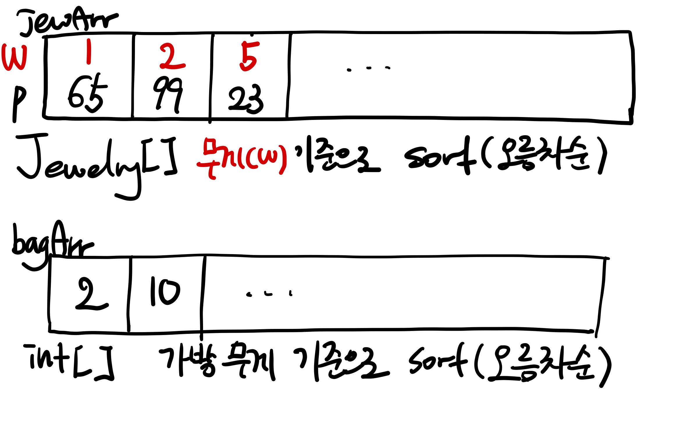 먼저 배열 두 개를 만든다. 하나는 보석이 담긴 배열, 그리고 다른 하나는 가방이 담긴 배열이다. 이 두 배열을 만들고 무게를 기준으로 오름차순 정렬을 진행하면 다음과 같다. 여기서 N개의 원소가 담긴 배열을 정렬하기에 NlogN의 시간 복잡도가 사용된다.