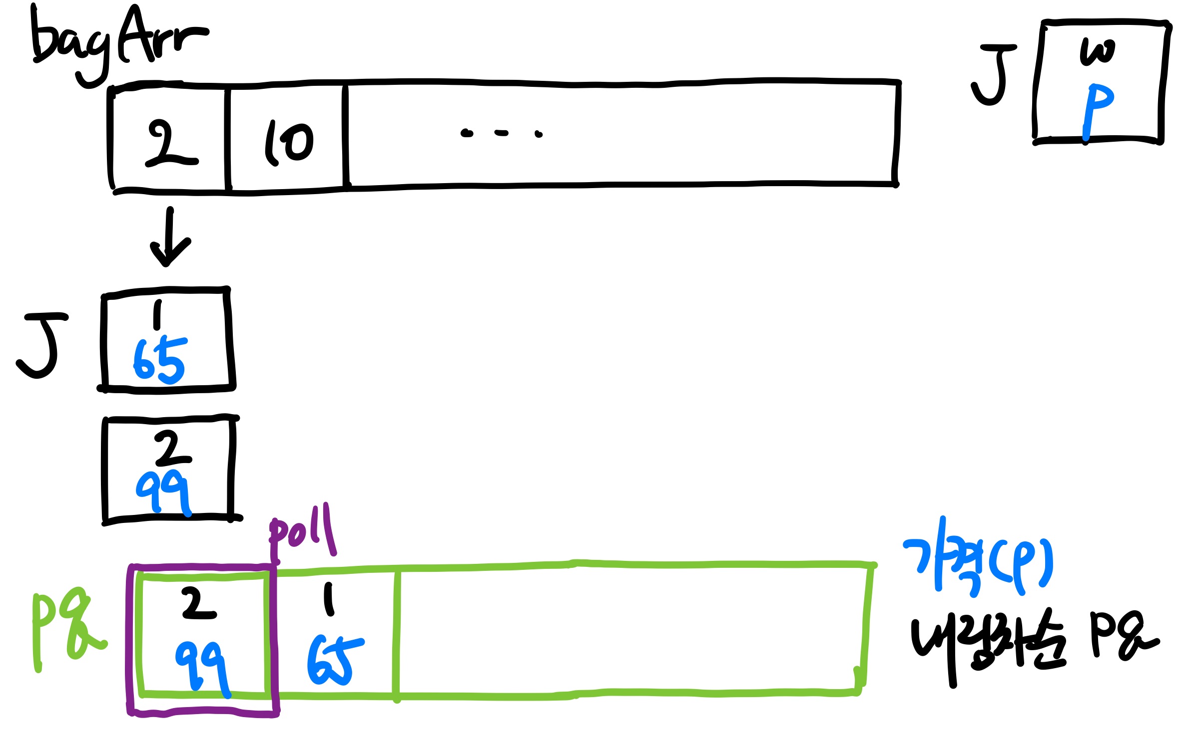 보석이 중복되서 가방에 들어가지 않게 보석을 pq에 담을 때 마다 idx를 하나씩 증가시켜 주고, 이미 가방에 담긴 보석은 pq에서 빼 내주기 때문에 중복해서 담을 수도 없도록 만들어 주면 매 번 가방을 탐색할 때마다 최적의 해를 찾아서 구해줄 수가 있다.