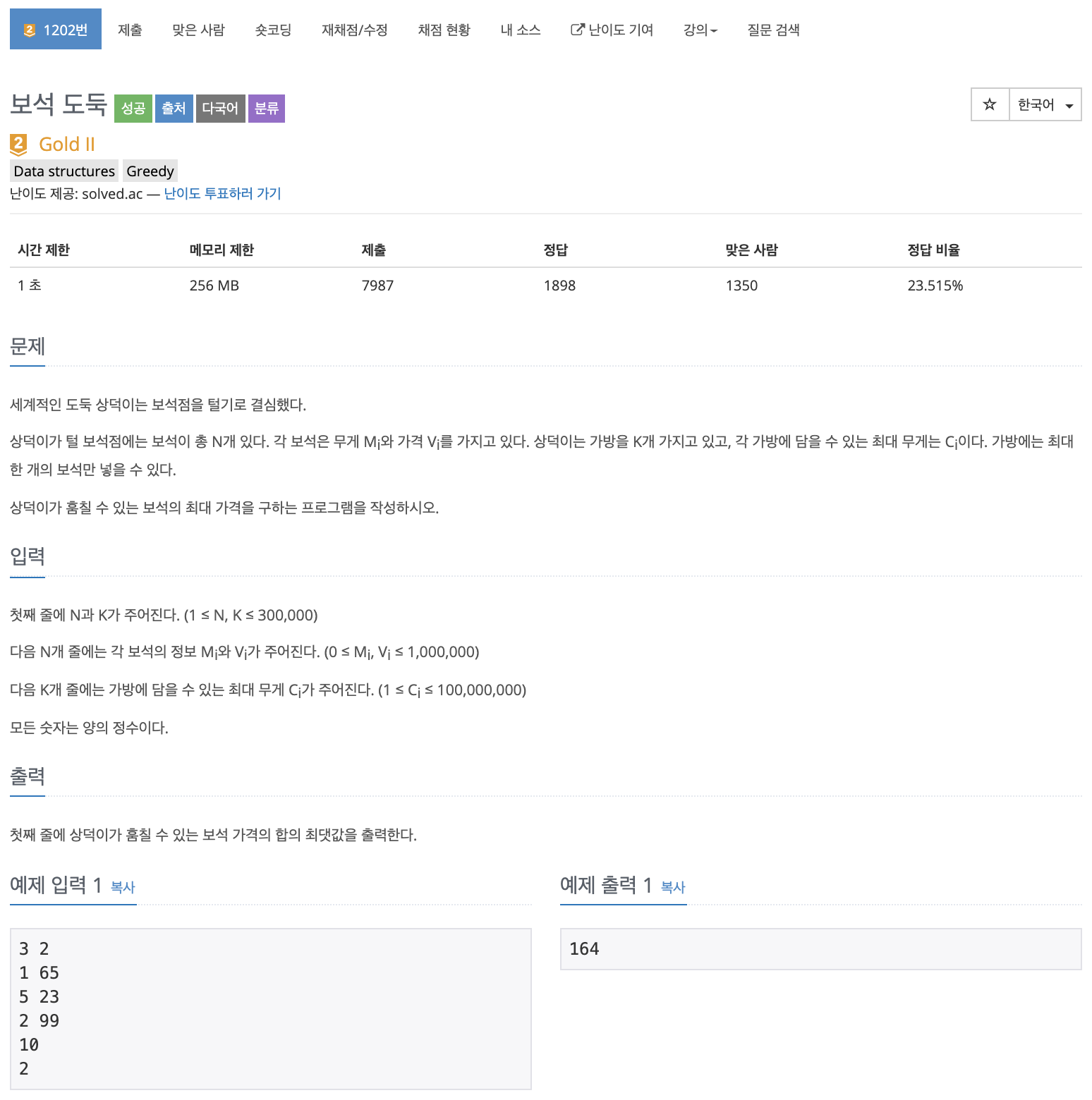 오늘 살펴볼 문제는 백준 1202번 <보석 도둑> 문제이다.