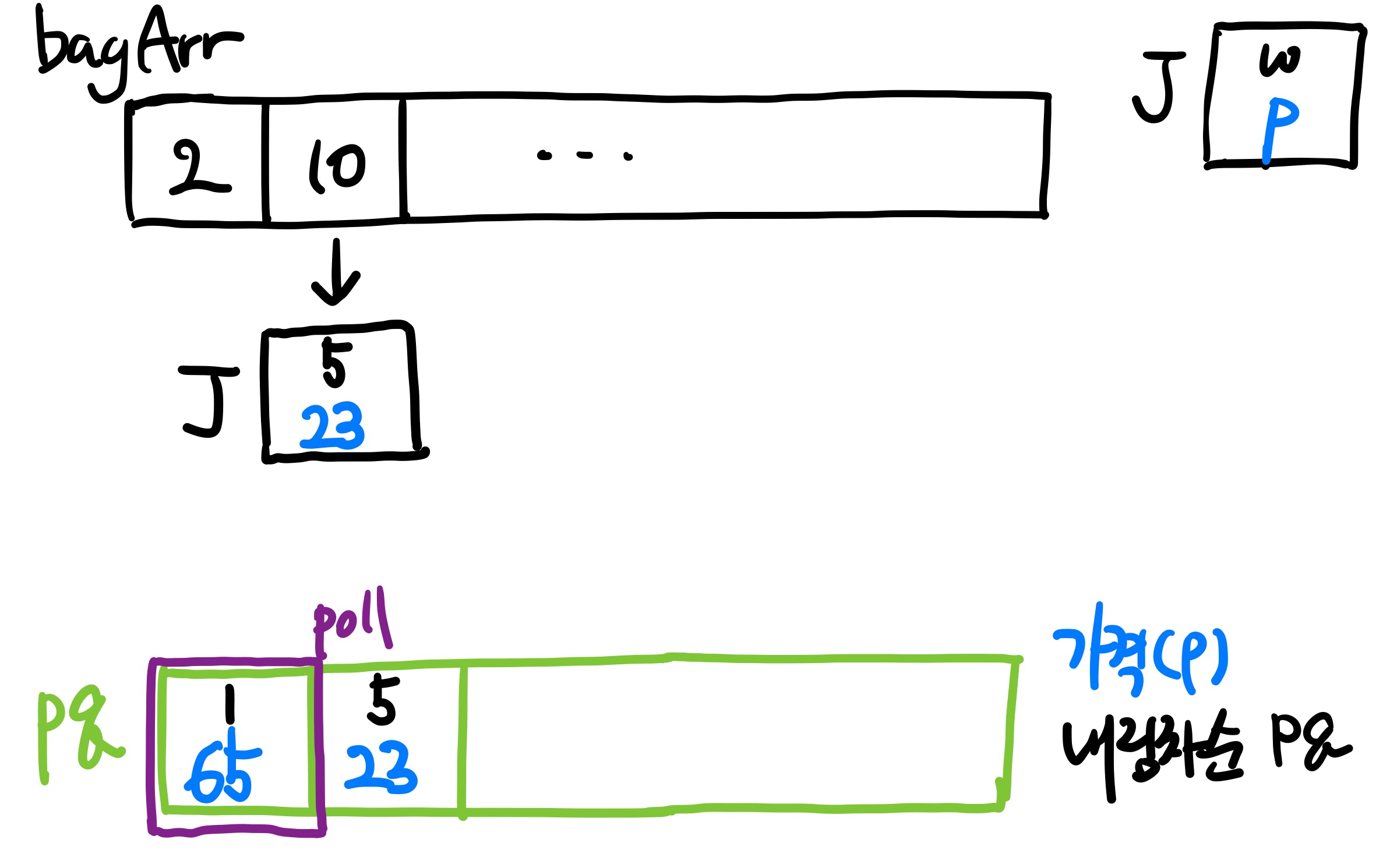 그리고 나서 가방 배열을 첫 번째 부터 하나씩 탐색하며 보석을 하나씩 넣어준다. 방법은 가방 배열 하나를 탐색할 때 마다 그 가방의 크기 이하의 무게를 가진 보석을 PriortyQueue에 담고, 해당 pq는 보석 가격을 기준으로 내림차순 되도록 만들었다. 즉 while 문을 돌고 나면, 해당 PQ의 첫 번째 값(pq.poll())이 해당 가방에 넣을 수 있는 가장 비싼 보석이 되는 것이다.