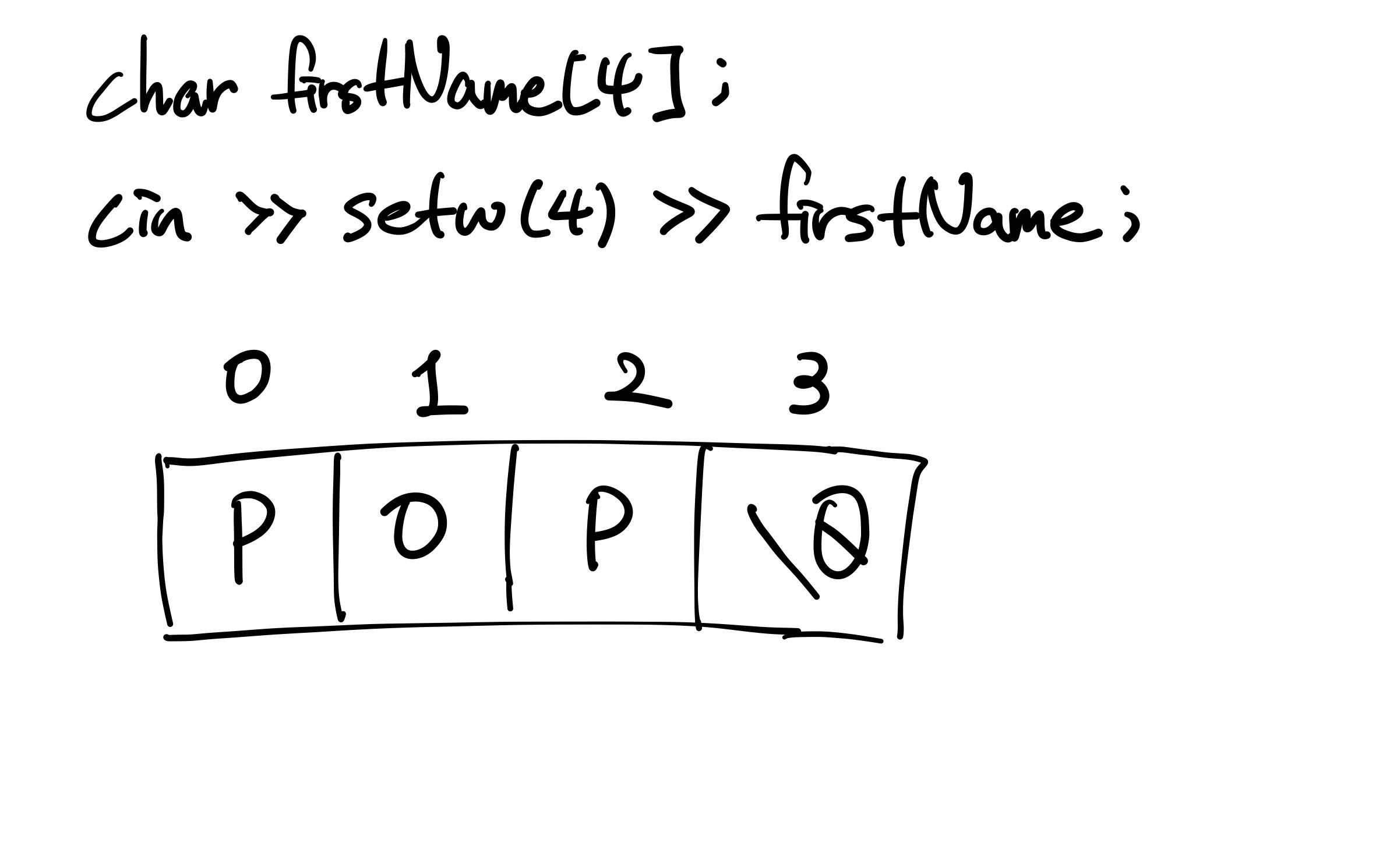 참고로 scanf 방식으로 값을 받는 것은 위험하다. 왜냐하면 문자 배열(ex. char firstName[4])이 어느정도 메모리를 할당 받는지 실행 중에는 알 수가 없기 때문이다. scanf()는 경계 검사를 하지 않는다. 그래서 일반적으로 스트링 뒤에 특수한 문자를 넣어서 여기서 스트링이 끝남을 표시한다. cin으로 값을 받는 것도 똑같은 문제가 있다. cin은 char 배열의 길이를 알 수가 없다.