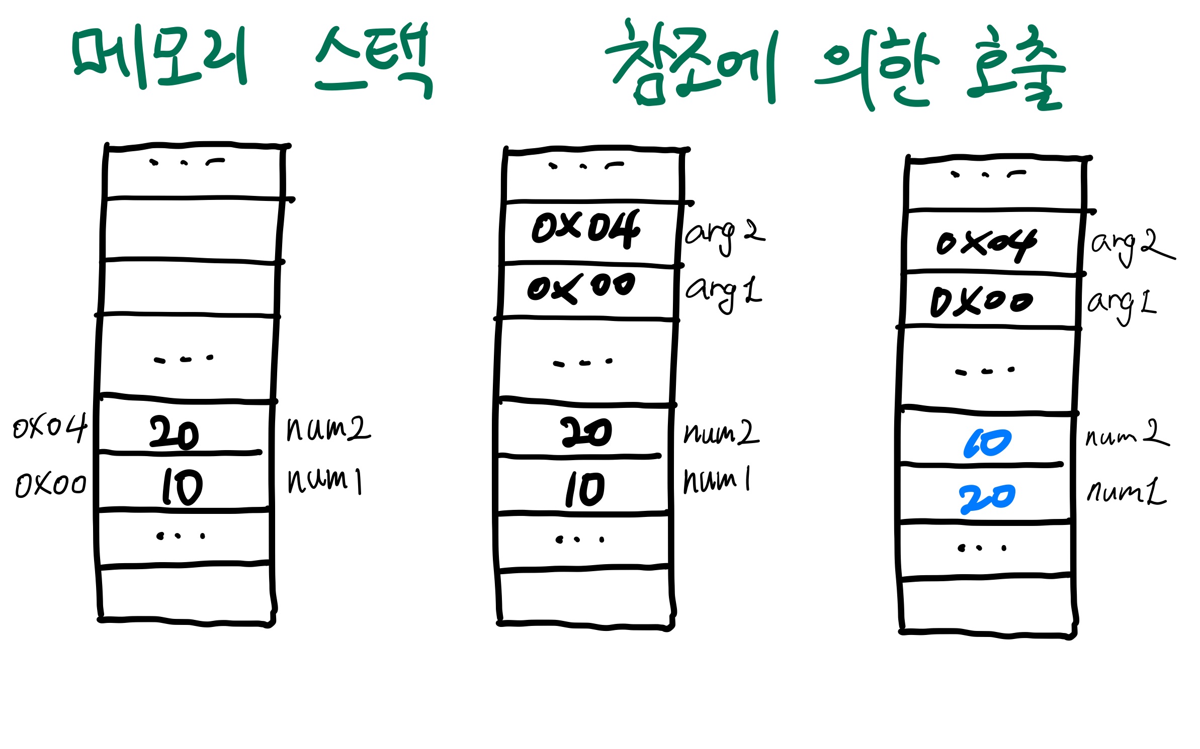 참조에 의한 호출은 C의 포인터 개념을 사용한다. 따라서 JAVA에는 없다. 그리고 C++에도 포인터는 있지만 뒤에서 더 좋은 방법으로 소개하고자 한다. 참조에 의한 호출을 하게 되면 해당 메모리의 주소값을 따로 저장하고, 그 주소값을 가지고 값의 원본을 바꾼다. 따라서 이렇게 값이 바뀌면 함수가 끝나도 메모리에는 바뀐 상태가 유지되는 것이다. 자바의 경우 원시타입은 값에 의한 호출, 객체 타입은 참조에 의한 호출을 한다.