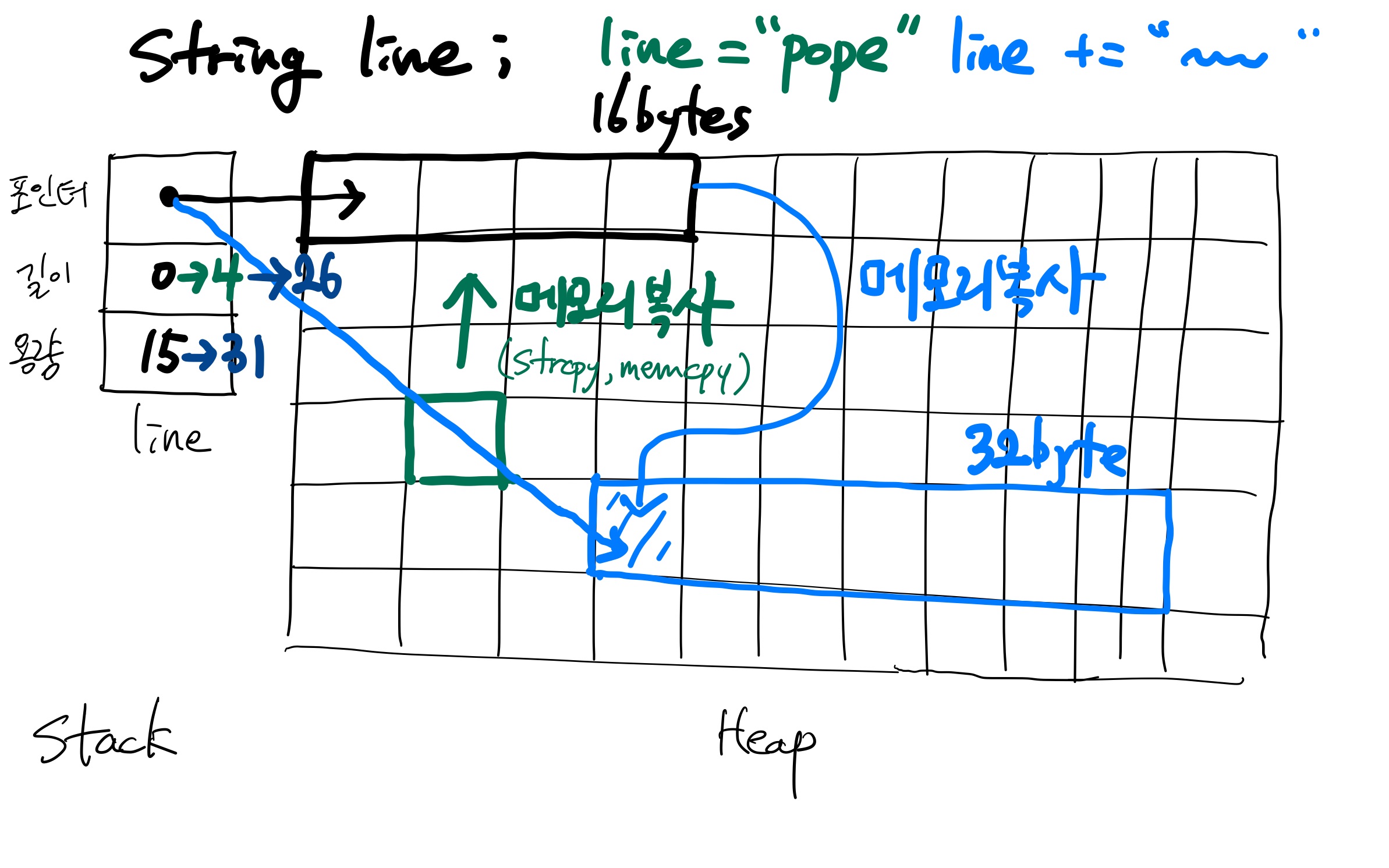 여기서 어떤 값을 대입(녹색)하면, 필요한 만큼(이 예제에선 4 byte) 메모리를 복사해서 검은색 구간의 첫 번째 칸에 넣어준다. 그리고 어떤 값을 덧붙이면(파랑), 이와 같이 메모리가 부족한 경우 새로운 메모리를 잡는다. 기존의 한 칸 메모리를 새로운 메모리에 넣어준다. 그리고 포인터를 새로운 메모리로 향하게 해준다. 용량은 31(32-1)로 늘어났고, 길이도 더해준 문자열 길이만큼 추가해 준다. 이와 같이 처리를 해주기 때문에 문자열의 길이를 정해주지 않고도 메모리 할당을 자동적으로 할 수 있는 것이다.