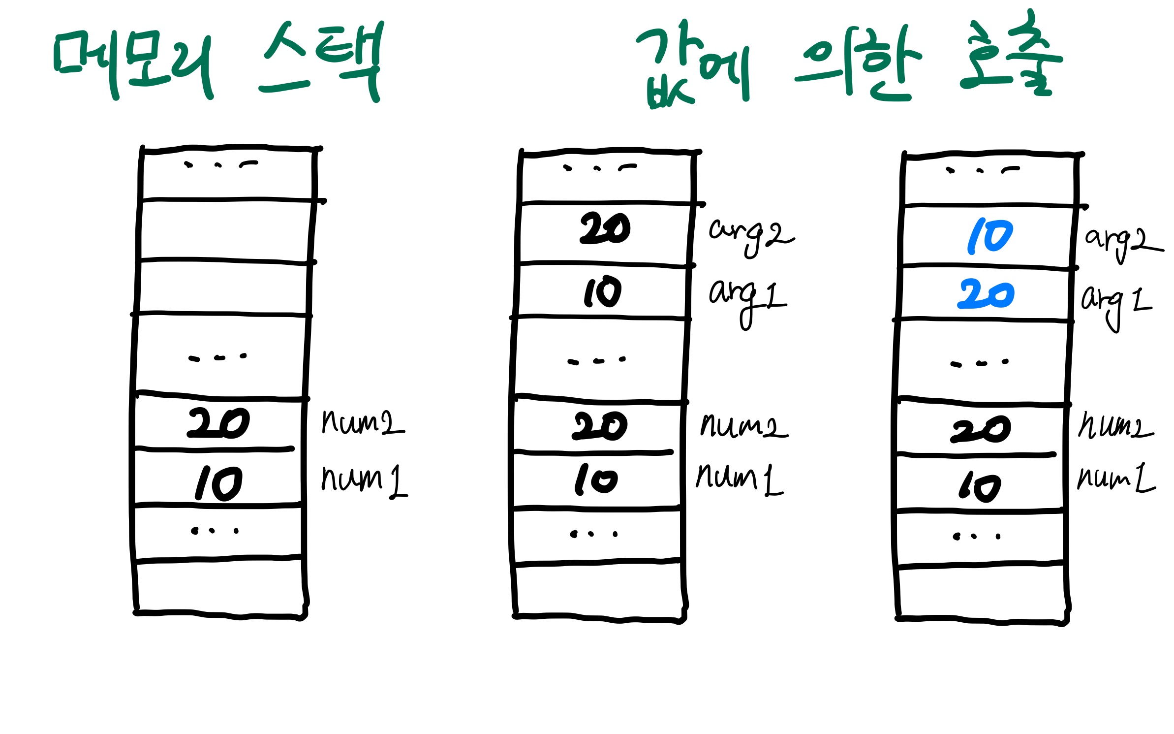 두 변수에 들어있는 값을 바꾸는 예제이다. 값에 의한 호출은 매개변수의 값을 다른 메모리에 먼저 복사를 한다. 그리고 바꾼 뒤, 그 바꾼 값은 함수가 끝나면 메모리에서 사라지게 된다. 아래의 그림은 스택 메모리를 단순하게 도식화하여 값에 의한 호출이 어떤 식으로 일어나는지를 나타내보았다.