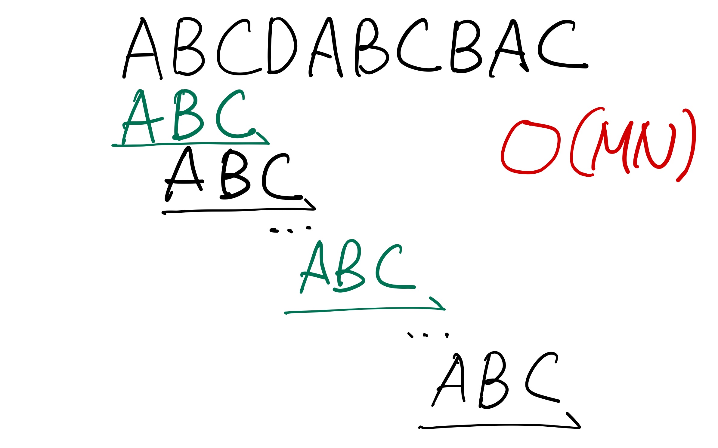 KMP 알고리즘은 어떤 문자열 안에 특정 문자열이 몇 개나 있는지를 찾는 알고리즘이다. 예를 들어 ABCDABC 안에 ABC는 2개가 있다는 것을 찾아내는 것이다. 일반적인 방법이라면 길이가 N인 문자열에서 길이가 M인 특정 문자열을 찾는다면 하나씩 다 탐색을 해볼 수 있고 결과적으로 M개의 문자열을 N번씩 탐색해 주어야 해서 O(NM)의 시간 복잡도가 나오게 된다. 쉽게 생각할 수 있지만 시간이 너무 오래 걸린다.