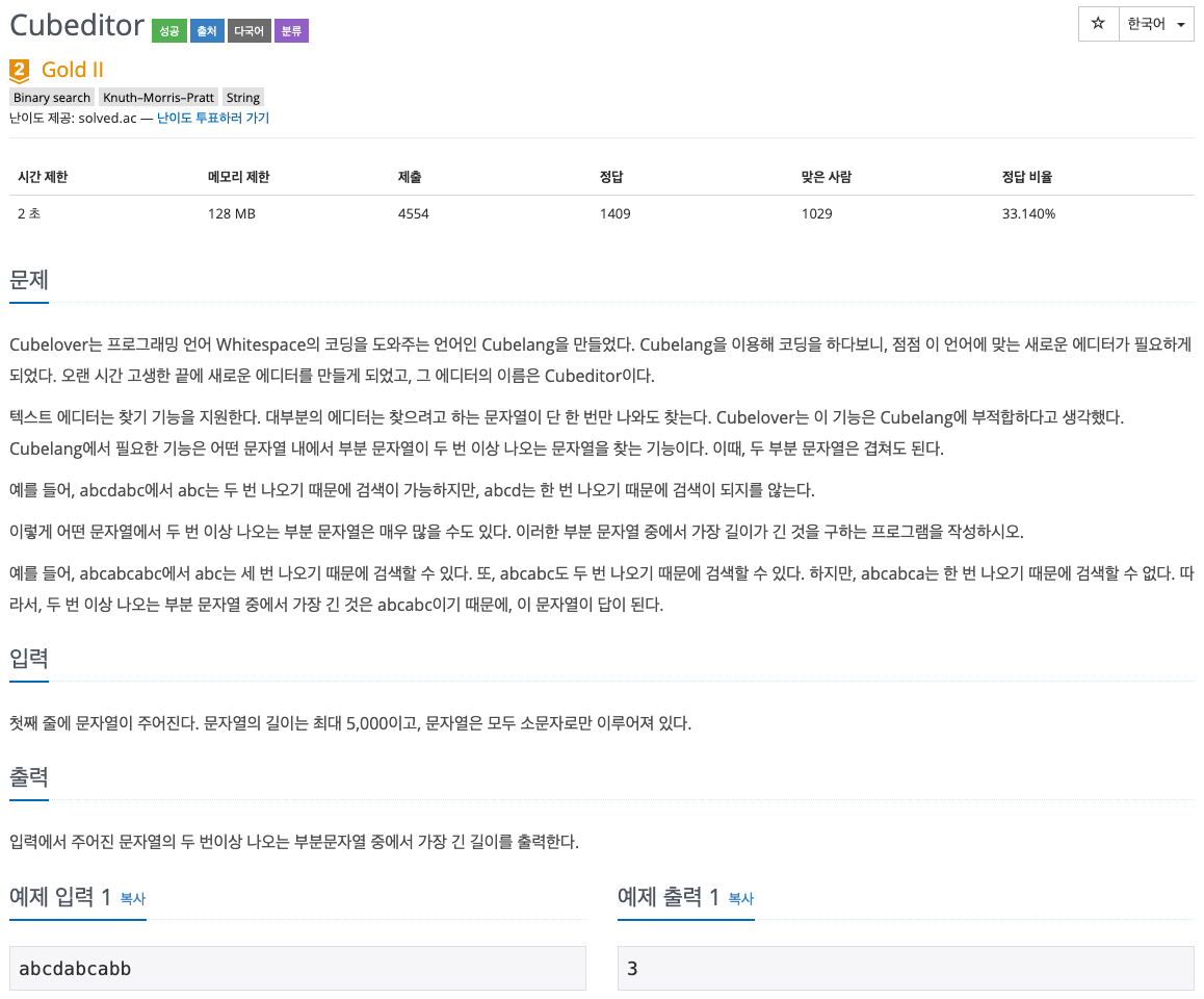 오늘 살펴볼 문제는 백준 1701 <Cubeditor> 문제이다.