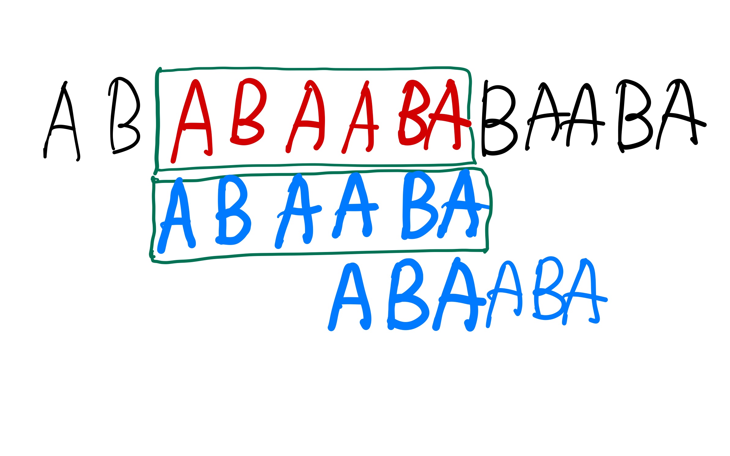 어떤 문자열이 주어지고 이 문자열에서 두 번 이상 나오는 부분 문자열 중에서 가장 길이가 긴 값을 구하는 것이다. 일단 전체 문자열에 대해서 Pi를 통해 가장 접두사 == 접미사 인 경우를 찾으면 최대 길이가 되는 경우도 있을 것이다. 마치 위에서 봤던 ABAABA 처럼 말이다. 두 문자열은 겹쳐도 상관이 없다. AAA 같은 문자열은 AA가 두 번 나오기 때문에 결과값이 2이다.