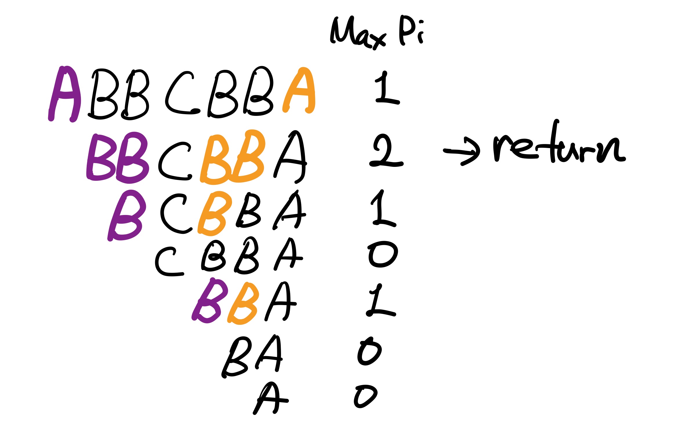 하지만 이렇게 전체 문자열 한 번에 대해서만 Pi를 구하면 ABBCBBA 와 같은 반례가 있다. 전체 문자열에 대해서는 접두사 == 접미사가 같은 최대 길이가 1인데 실제로는 BB가 두번 나와서 결과값은 2가 된다. 따라서 길이가 n인 어떤 문자열이 주어졌을 때 i = 0 부터 n-1 까지의 경우에 대해 인덱스가 i부터 n-1 까지인 모든 문자열에 대해서 Pi를 구해주고 각각의 최대값을 모두 구해서 그 중에 최대값을 리턴해야 한다.
