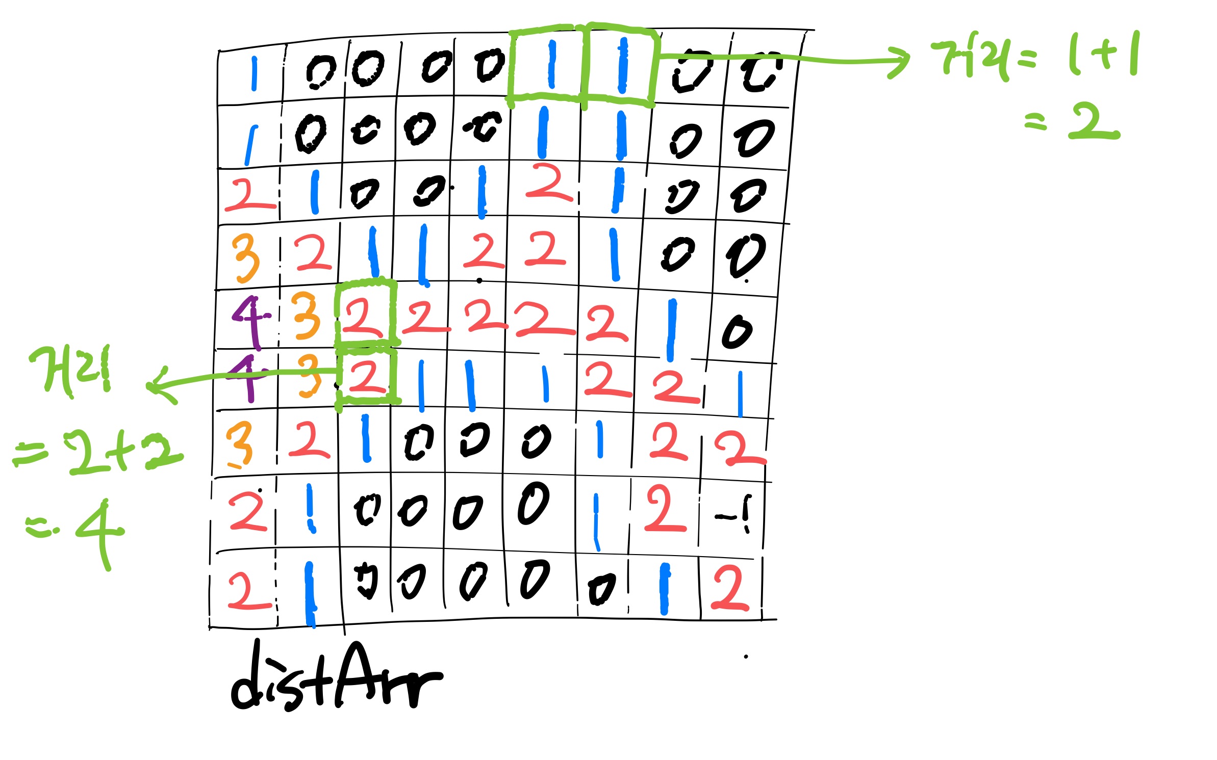 이렇게 거리를 계산하다보면 인접한 점의 distArr 배열값이 이미 자연수로 정해진 경우가 있다. 그 경우는 값을 갱신해 주지 않는다. 즉, distArr에서 모든 점을 탐색하고 나면 각각의 점은 섬으로부터의 최단 거리가 되는 것이다. 그렇게 계산을 마치면, distArr에서 임의의 한 점과 그 인접한 점의 합이 최소가 되는 점을 찾는다. 그 값이 최단거리가 되는 것이다.