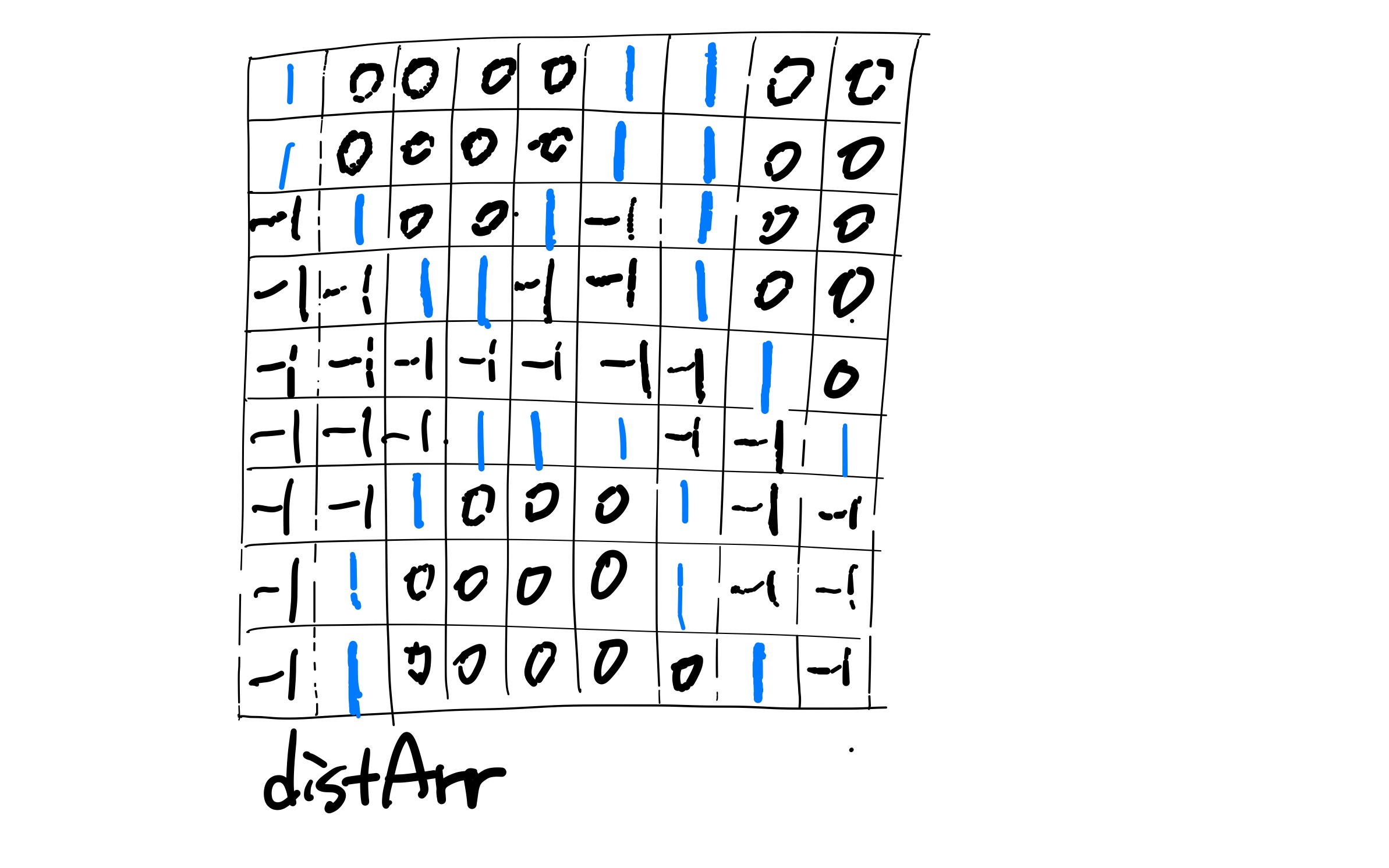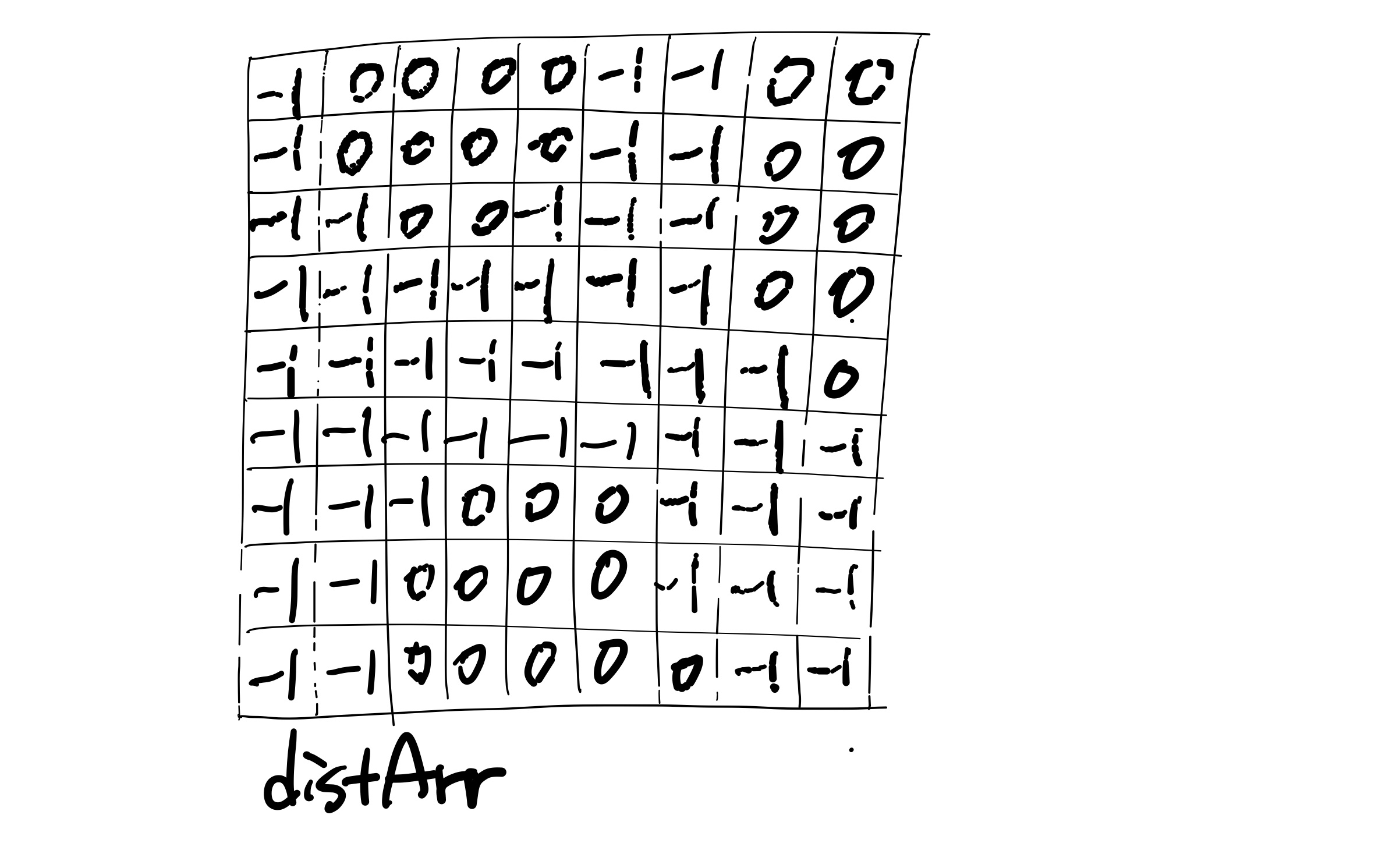 이렇게 만들고 나서 distArr에서 BFS를 통해 모든 점에 대해 섬에서부터 거리가 얼마나 되는지를 계산한다. 섬 위에 있다면 당연히 그 값은 0이다. 그리고 그 섬에서 인접한 값들은 1이고 그 값에서 인접한 값은 2일 것이다. 그런식으로 -1로 초기에 설정된 점들은 섬들로부터 최단거리를 계산해서 그 값을 넣어 준다.