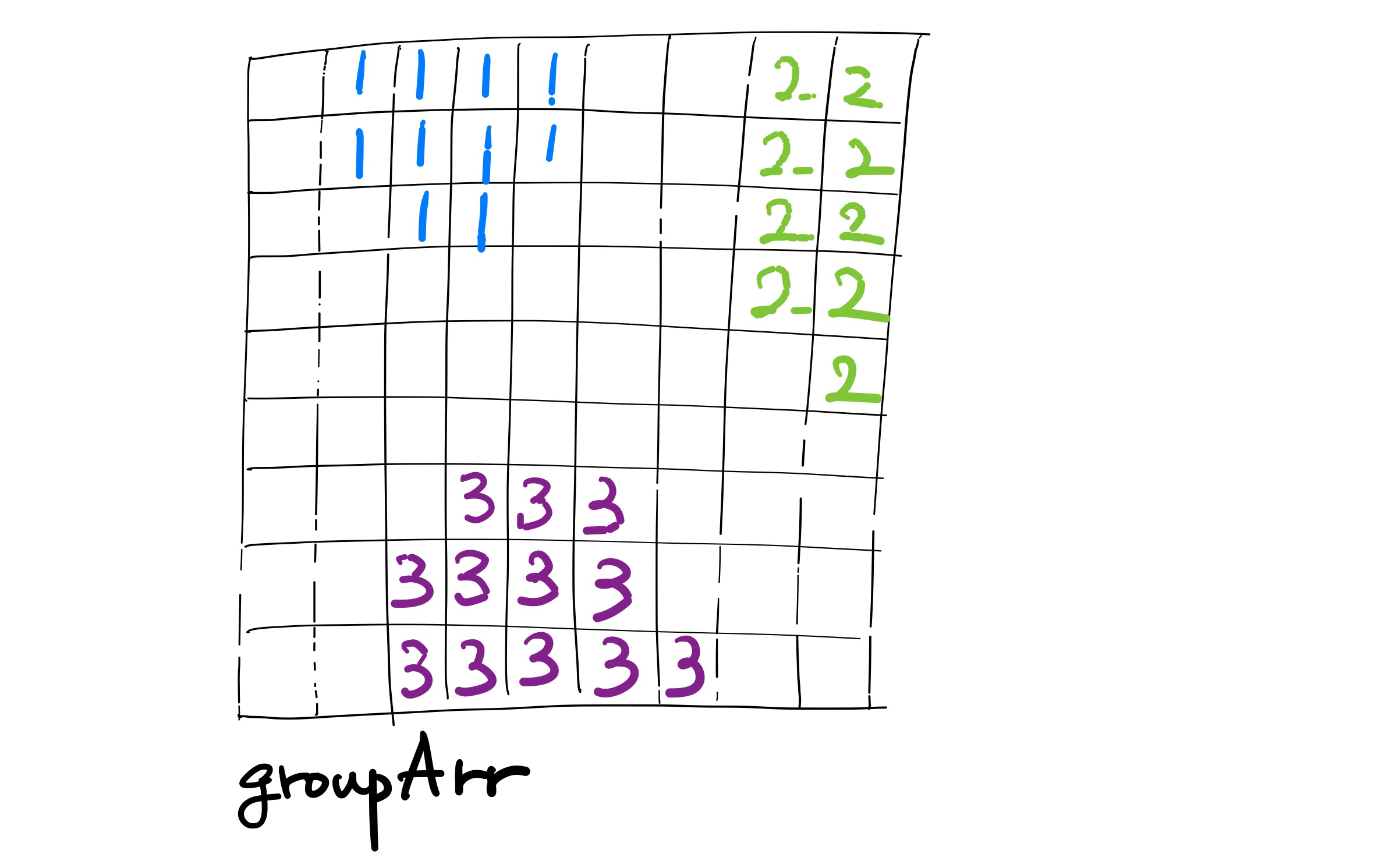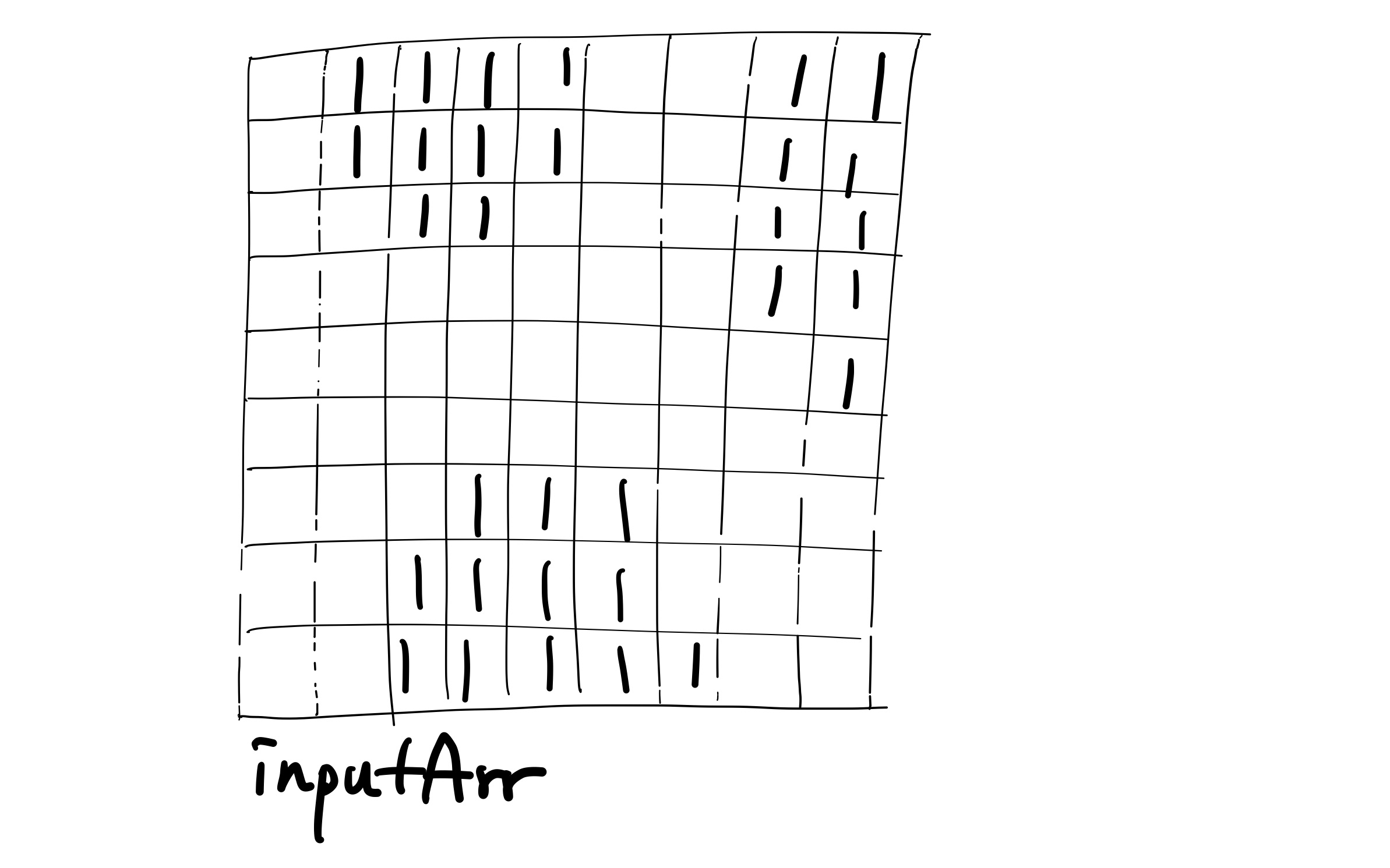 이제 문제를 보도록 하자. N X N의 배열이 주어지고 섬이 있는 곳은 1, 없는 곳은 0으로 input 값이 들어온다. 나는 이 값을 받는 inputArr 행렬을 하나 만들고, 각 섬들을 그룹화한 groupArr, 섬으로부터의 거리를 나타낸 distArr 이렇게 세 개의 배열을 만들어서 문제를 풀었다. groupArr는 섬을 한 그룹씩 순서대로 인덱싱을 해서 1,2,3, .. 이런식으로 같은 섬은 같은 숫자를 입력해 주었다. 그리고 distArr는 섬인 경우는 초기값을 0으로 나머지는(섬이 아닌 곳) -1로 해서 구분을 해 주었다. (그림에서 빈 칸은 모두 초기값 0이며 생략했다)