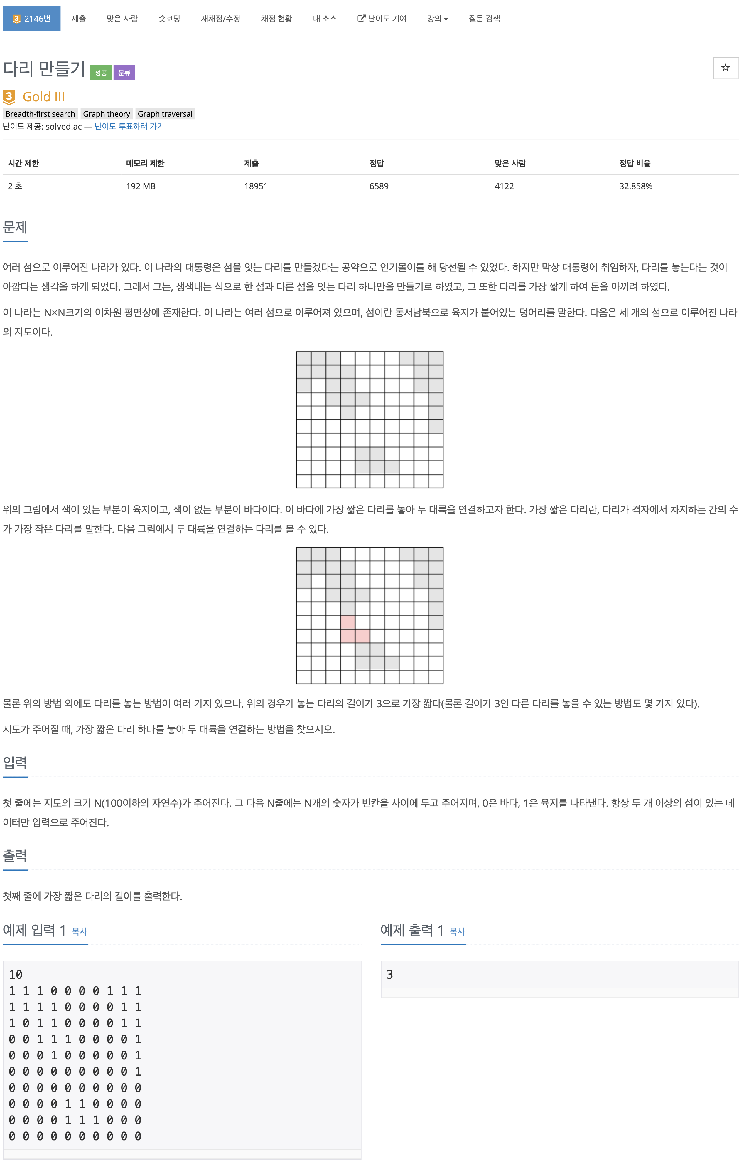 오늘은 오랜만에 BFS 문제를 풀어보려 한다. 백준 2146번 다리 만들기 문제이다.