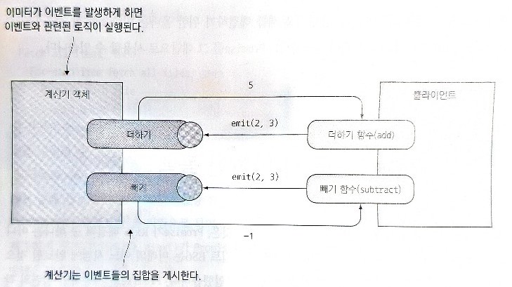콜백을 사용하는 사례로 이벤트 이미터(Event Emitter)를 생각해 볼 수 있다. 이벤트 이미터는 비동기 이벤트 기반 아키텍처에서 널리 사용되는 기술 방식이다. Node.js 같은 서버에서는 특정 종류의 객체가 주기적으로 함수를 호출하는 이벤트를 생성한다. Node.js에서 EventEmitter 클래스는 웹소켓 I/O 또는 파일 읽기/쓰기와 같은 API를 구현하여 디렉터리를 순회하는 중에 관심있는 파일을 발견하면 객체가 해당 파일을 참조하는 이벤트를 발생시켜 추가 코드를 실행하게 한다.