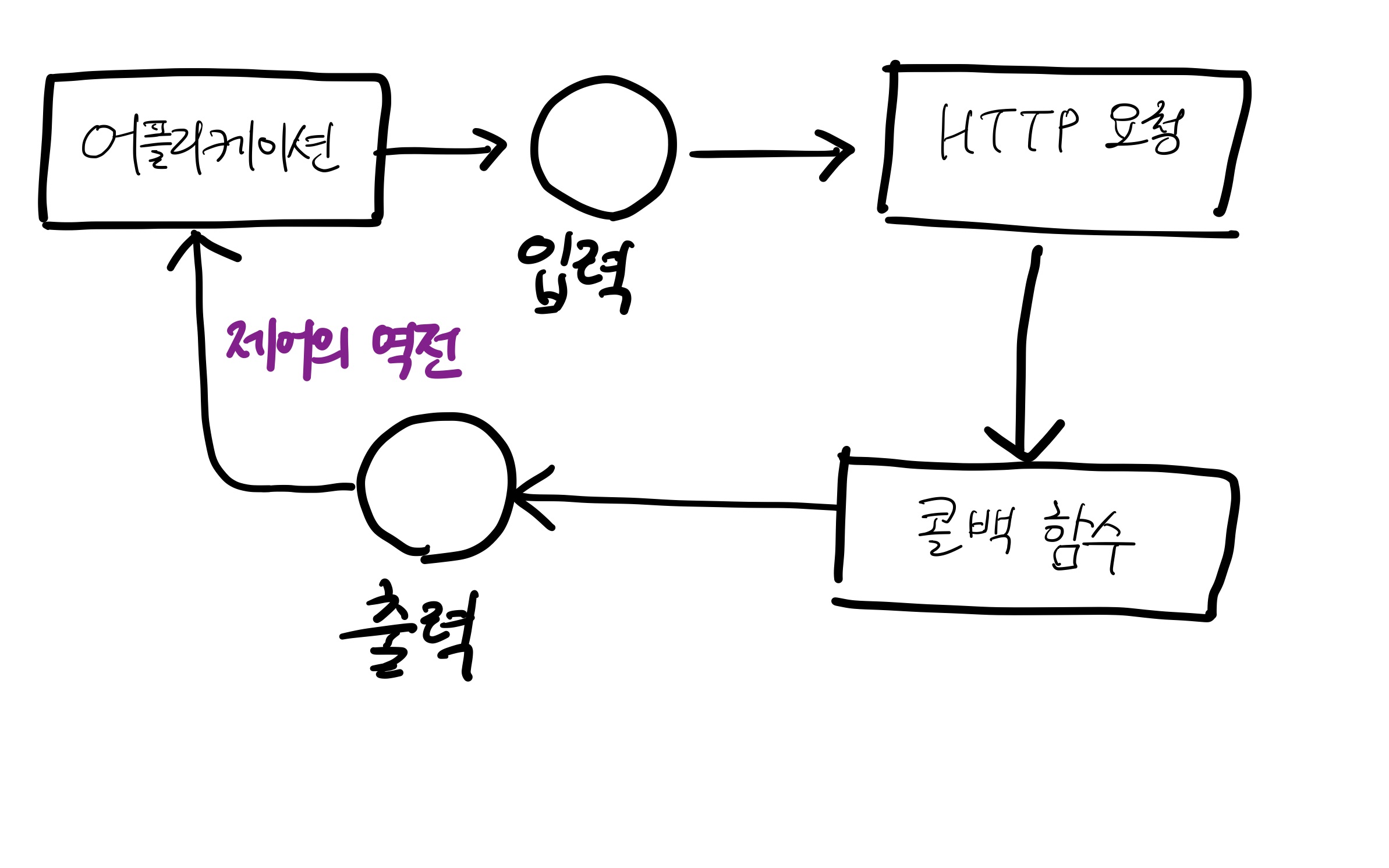 자바스크립트는 싱글 스레드 언어이기에 위와 같은 구조가 필요하다. 데이터를 사용할 준비가 되면 자바스크립트 런타임에 호출할 처리 함수를 제공함으로써 장기 실행 작업 및 블로킹 문제를 해결하고자 콜백 함수가 쓰이게 되었다. 그 동안 어플리케이션은 계속해서 다른 작업을 수행할 수 있다. 이 때 제어의 역전이 발생하는데, 제어의 역전이란 코드의 특정 부분이 런타임 시스템에서 제어의 흐름을 되돌려 받는 방식을 말한다. 콜백 함수가 데이터를 처리할 준비가 되면 런타임이 함수 처리기를 통해 어플리케이션을 다시 호출하거나 제어권을 돌려준다.