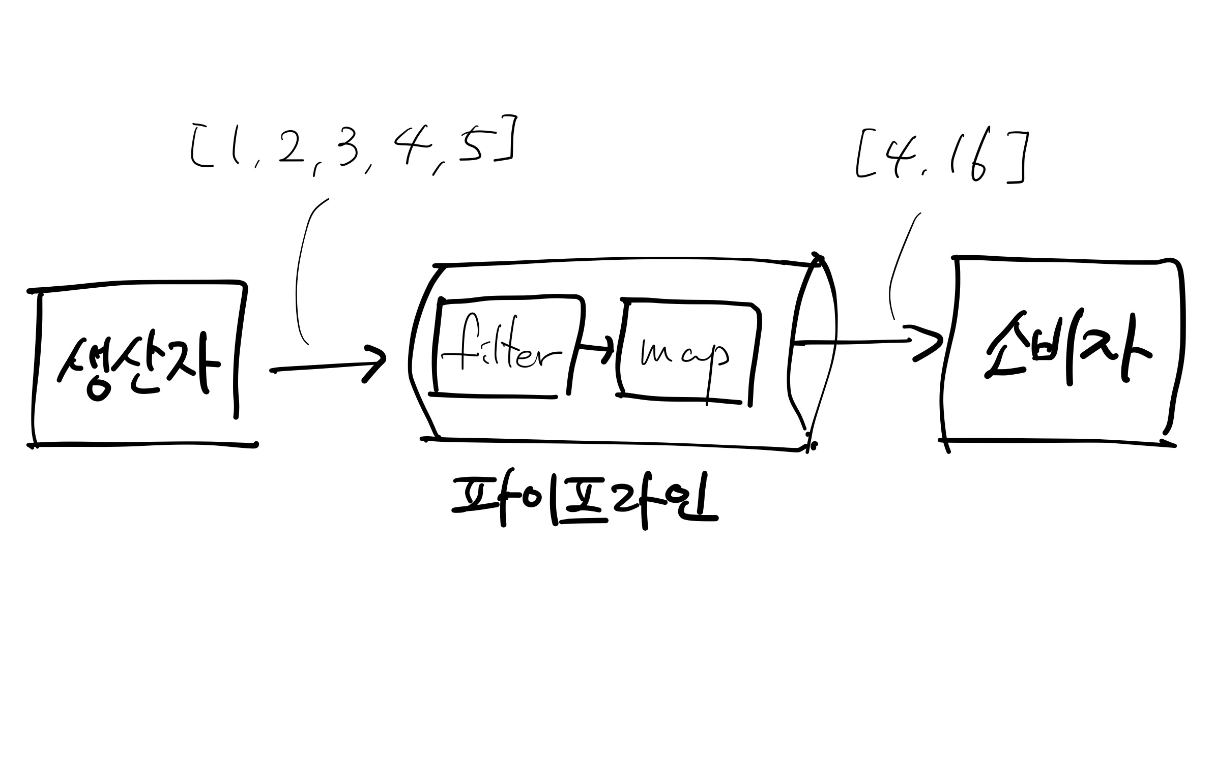 스트림 생산자와 소비자 사이에 일어나는 작업을 파이프라인이라고 한다. 간단한 예제를 살펴보자. 지금까지는 정적 데이터 소스로 스트림을 만들었지만 앞으로는 동적 데이터 소스로 확장해서 사용할 수 있다.