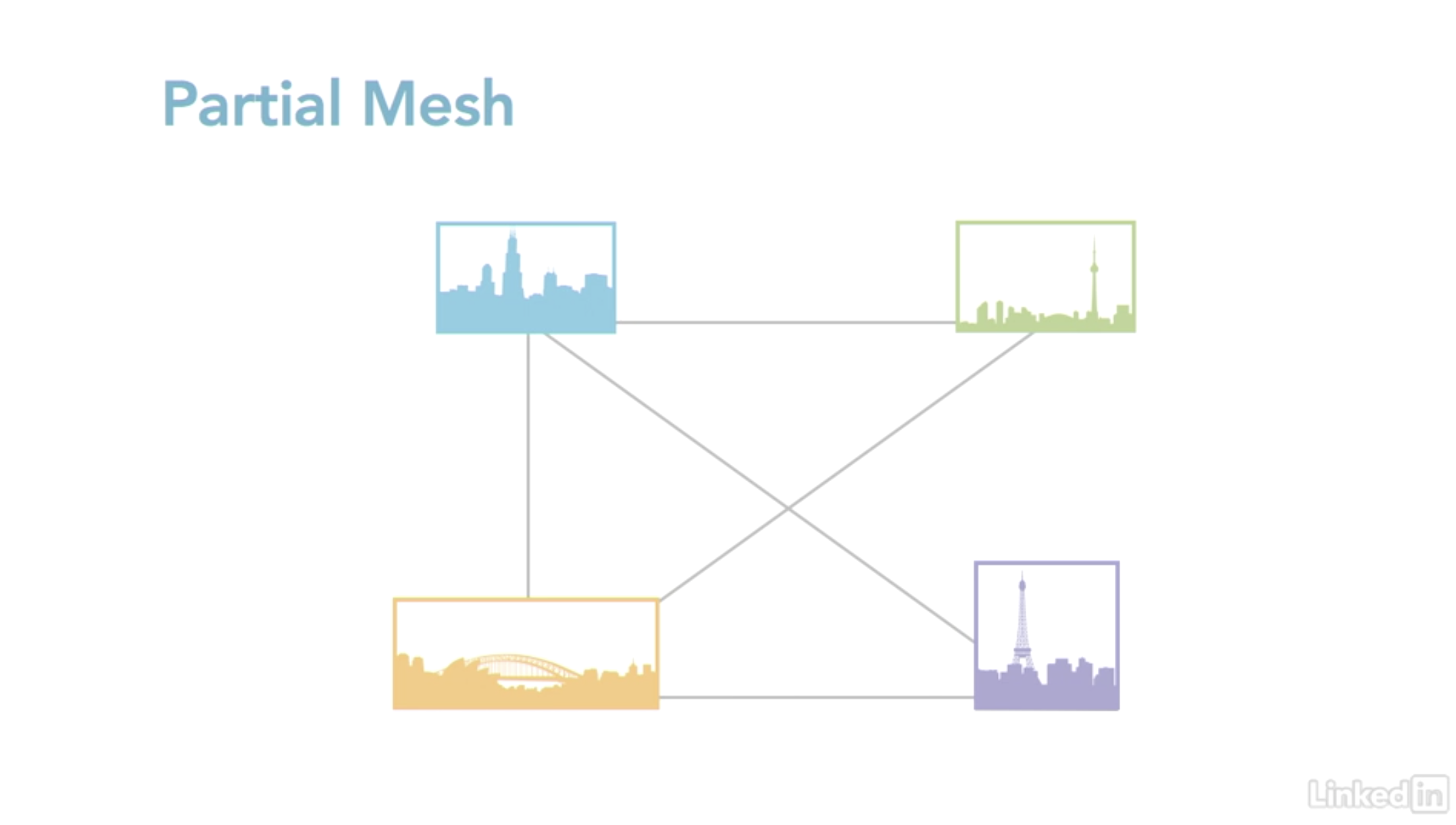 부분 연결형은 모든 장치들이 최소 두 개 이상의 장치들과 연결되어 있는 경우이다. 100%는 아니지만 높은 Redundancy를 제공하며 Full Mesh 보다는 저렴하다. 이 역시 WAN 환경에서 많이 발견된다.