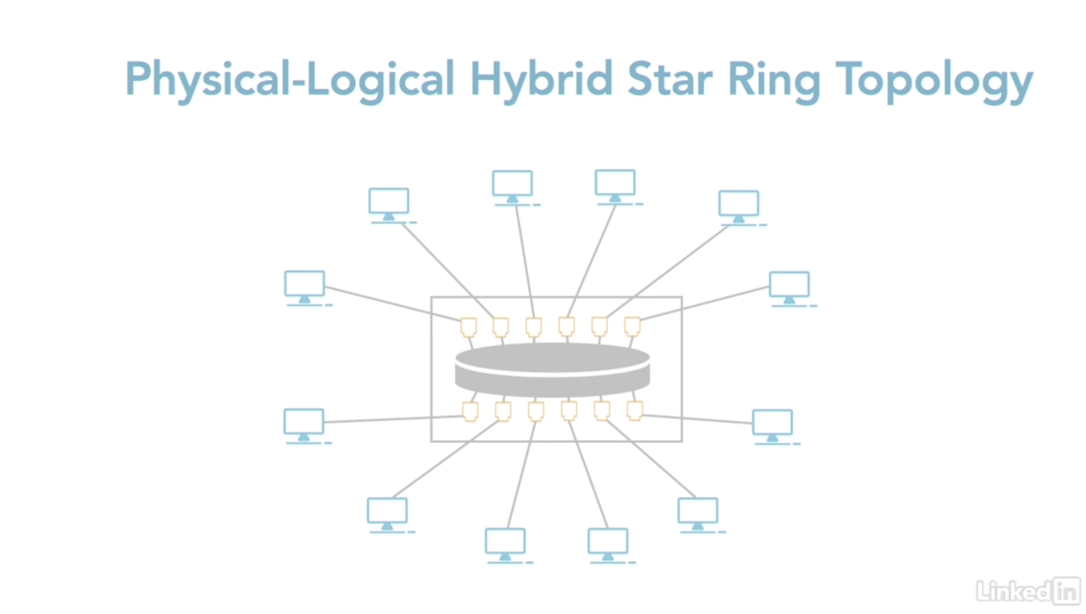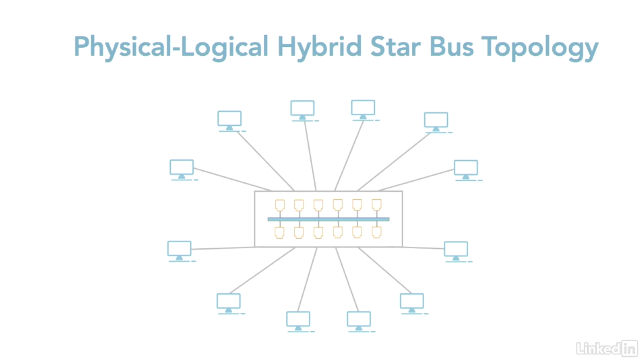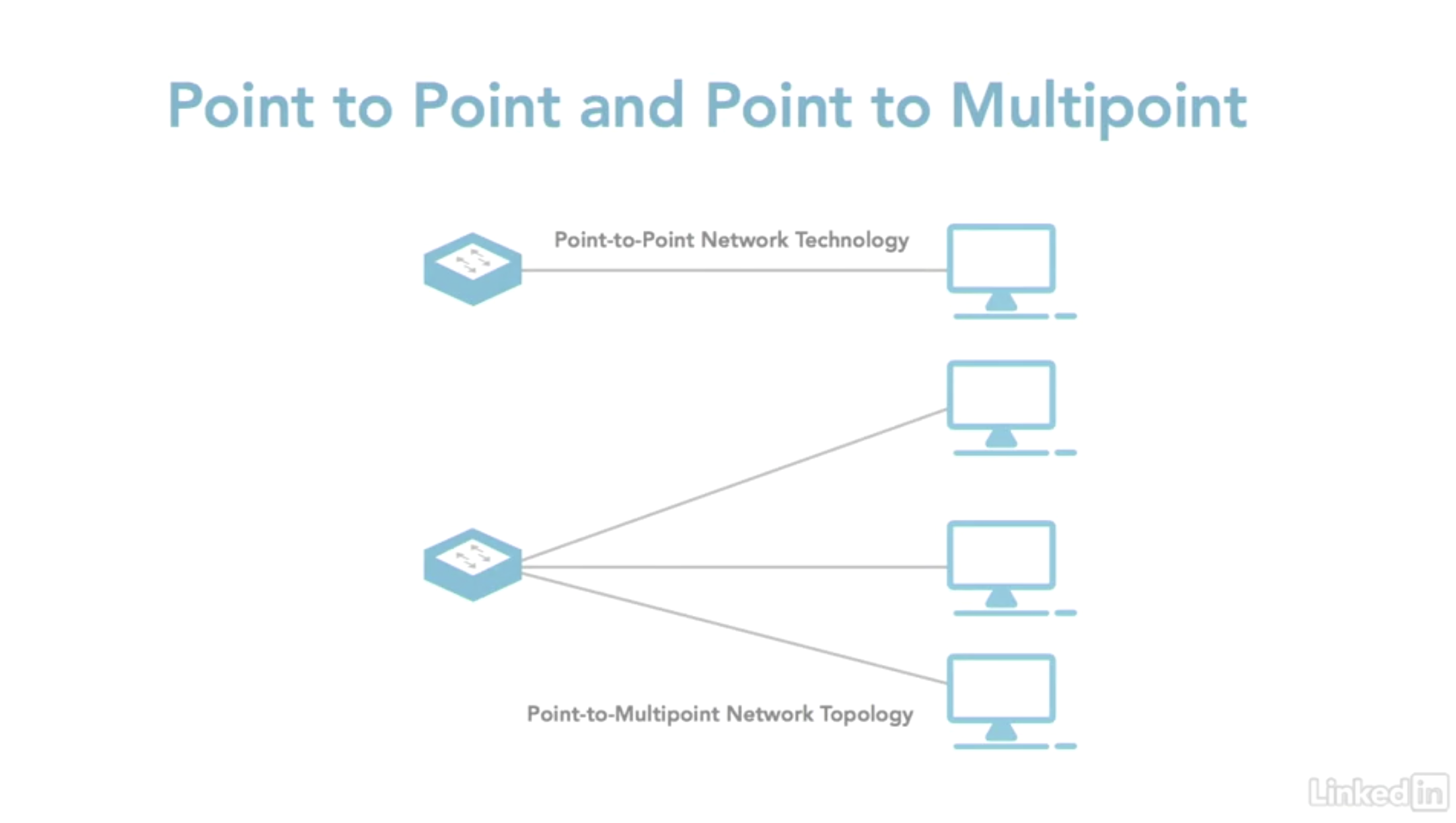- Point-to-Multipoint 토폴로지 : 두 대의 컴퓨터를 교차하는 케이블로 연결할 때 사용된다. 하이브리드 시스템의 부분으로 사용되기도 하며 하나의 장치가 하나 이상의 다른 장치와 연결될 수 있다는 점을 빼면 나머지는 동일하다.