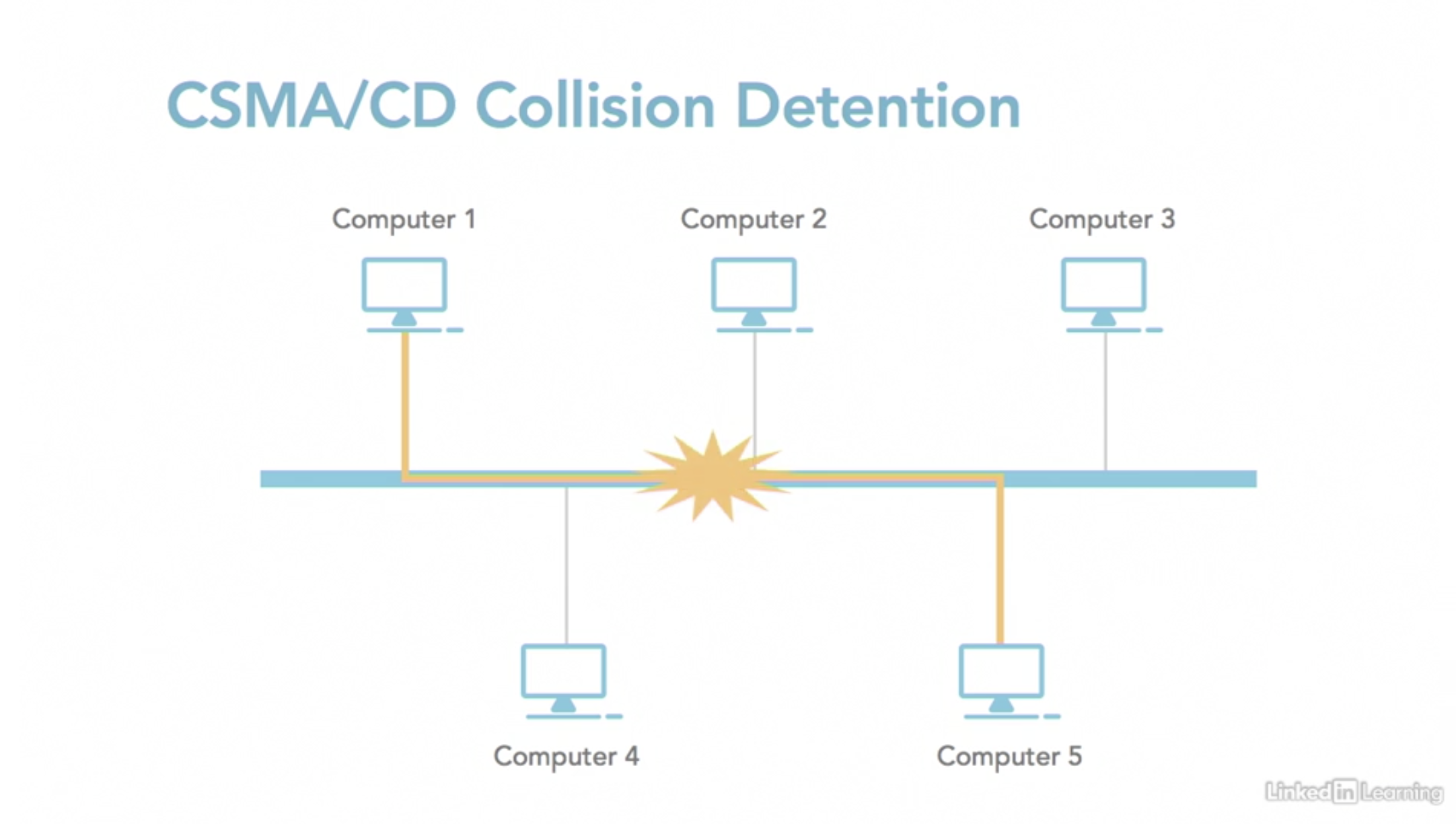 많은 노드가 활성화 될 수록 네트워크에서 충돌이 많이 일어나게 된다. 충돌 이후 노드들은 다시 신호를 보내기 시작한다. 만약 너무 많은 충돌이 일어나면 네트워크가 멈춘다. 일반적으로 30개 이하의 노드에서 사용하기를 권장한다. 가장 저렴한 토폴로지 방식이며 하나의 노드나 케이블이 전체 네트워크에 영향을 끼칠 수 있다는 단점이 있다.