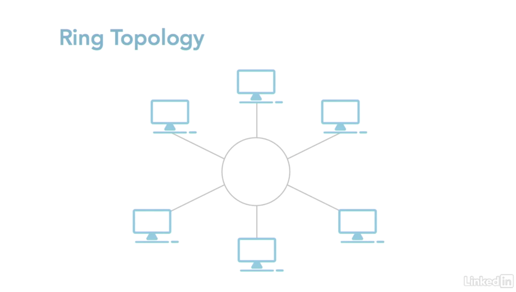 모든 노드가 링 형태로 연결되어 있는 토폴로지이다. 컴퓨터를 하나의 원을 이루도록 연결하며 각 장치는 고유한 주소를 가지게 된다. 그리고 케이블로 고리를 형성하고 이 고리에는 네트워크 장비들을 설치한다. 패킷(신호)은 네트워크 주변을 링 형태로 돌며 이동한다. 각각의 노드는 신호를 보낼 수 있는 기회가 주어지며, 노드 간 연결은 없다. 높은 트래픽이 와도 네트워크가 멈추지 않으며 단지 속도를 조금 늦추게 된다. 그리고 하나의 손상된 노드나 케이블이 네트워크를 멈추게 할 수 있다.