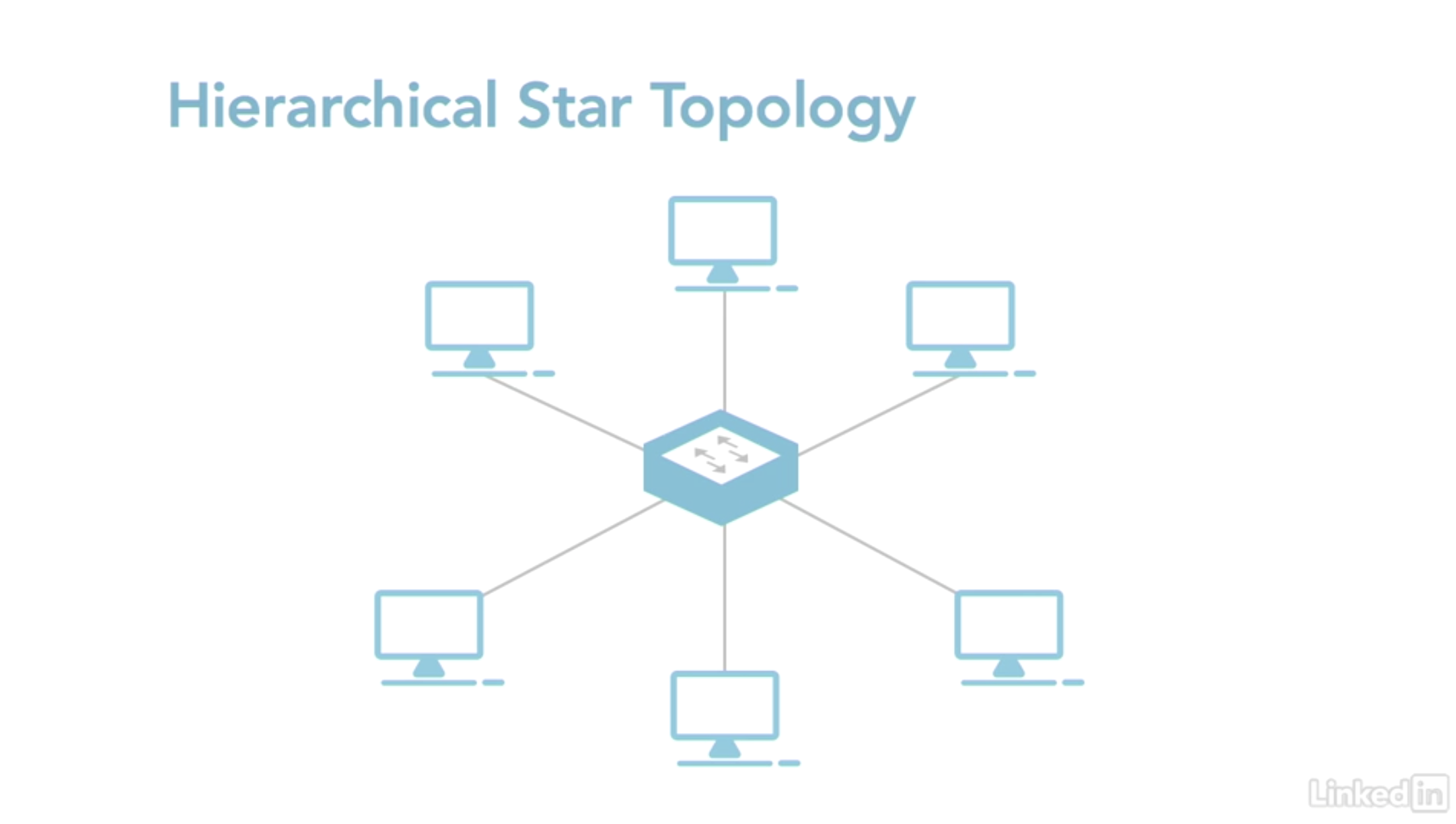 - Point-to-Multipoint 토폴로지 : 두 대의 컴퓨터를 교차하는 케이블로 연결할 때 사용된다. 하이브리드 시스템의 부분으로 사용되기도 하며 하나의 장치가 하나 이상의 다른 장치와 연결될 수 있다는 점을 빼면 나머지는 동일하다.