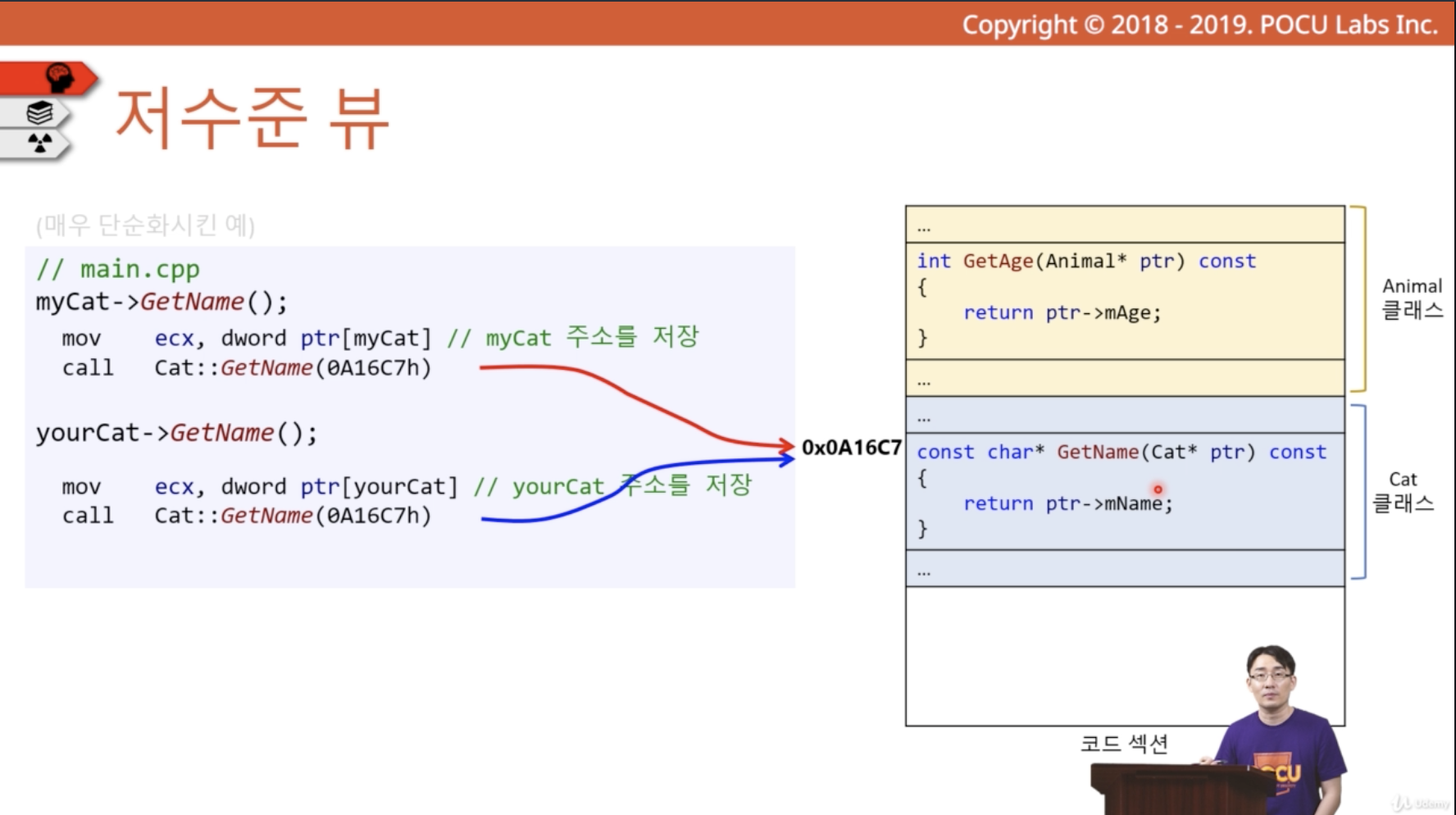 다형성은 같은 무늬를 가진 객체가 실제로 실행해 보니 다르게 동작하는 현상을 말한다. 다형성에 대해 알기 전에 멤버함수에 대해서 이해할 필요가 있다. 멤버 함수는 메모리 어딘가에 위치해 있다. 이러한 멤버 함수는 컴파일 시에 딱 한 번만 메모리에 할당이 된다. 저수준에서는 멤버함수와 전역함수가 크게 다르지 않다. 코드 레벨에서 확인해 보면 두 클래스(부모클래스가 같은 두 자식 클래스) 안의 멤버함수는 같은 메모리에 들어있으며 나 자신의 포인터로 작동함을 알 수 있다.