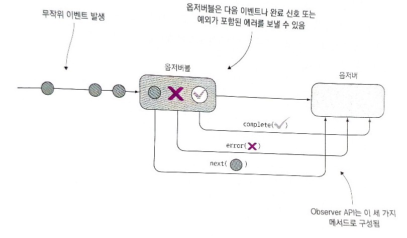 Rx에서 옵저버는 옵저버블을 구독한다. 옵저버는 옵저버블에서 방출된 모든 이벤트에 비동기로 반응하므로 대규모 이벤트가 발생하면 흐름을 차단하는 대신 어플리케이션을 유연하게 유지할 수 있다. 옵저버블은 현재의 값이 아니라 미래에 발생할 값에 대한 개념을 나타낸다는 점을 이해하는 것이 중요하다.