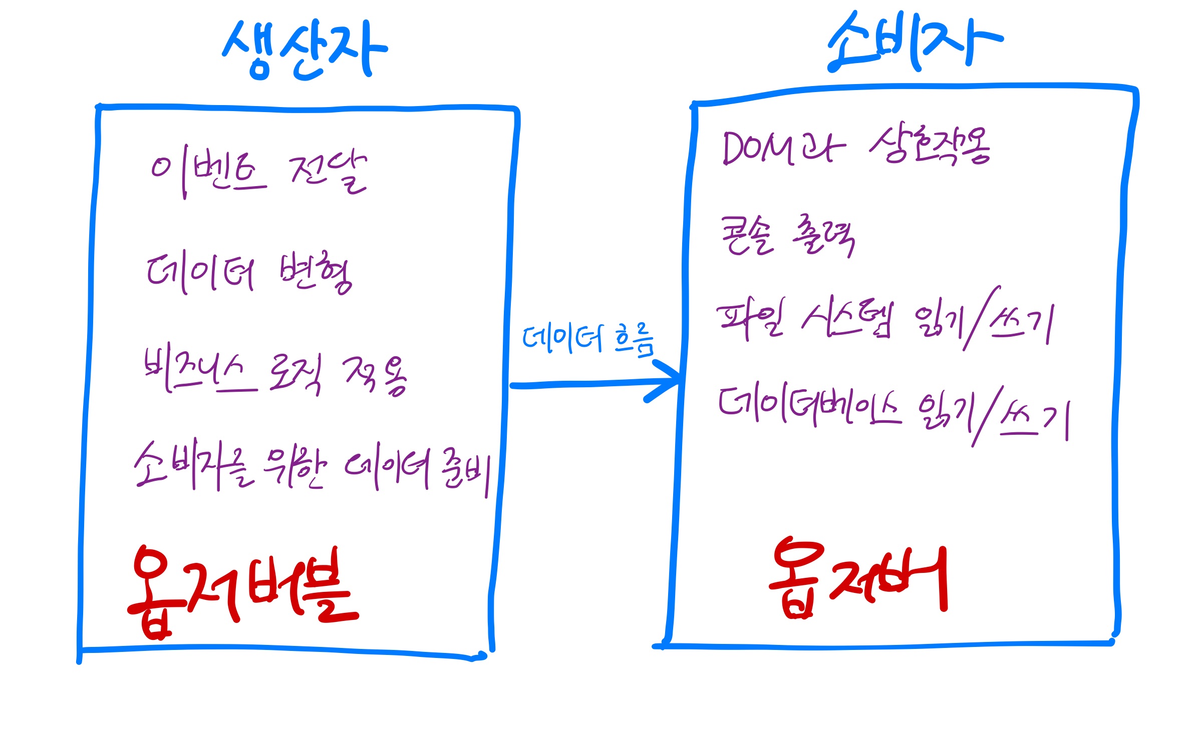 - 방출 데이터 (emitted data) : 방출 데이터는 시스템과의 상호 작용 결과로 생성되는 데이터이다. 예를 들면 마우스 클릭과 같은 사용자 상호 작용이나 파일 읽기 같은 시스템 이벤트가 있다. 데이터를 요청하고 미래의 어느 시점에 응답을 받는다.