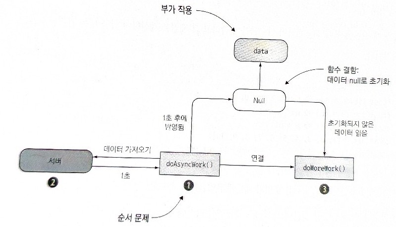 서로 다른 컴포넌트에서 데이터 구조를 공유하고 사용하는 동시성 비동기 프로세스가 있는 경우에도 문제가 발생할 수 있다. 자바스크립트는 싱글 스레드 언어이기 때문에 다른 쓰레드의 공유 상태를 걱정할 필요가 없다. 하지만 웹 워커(Web worker)를 사용하거나 HTTP 호출을 동시에 할 때 동시성 코드를 다루게 된다. 아래의 그림의 경우 doAsyncWork() 함수가 서버에서 데이터를 불러오는 시간은 항상 일정하지 않고 때로는 오래 걸릴 수도 있기 때문에, 만약에 그 데이터가 불러오지 않은 상태에서 doMoreWork()로 전달될 경우 이 함수는 올바르게 실행될 수 없다.