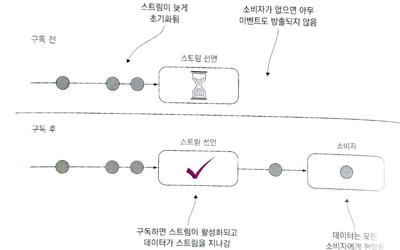 Rx에서 스트림은 Iterator 인터페이스를 준수하며, 이 스트림의 구독자는 그 안에 포함된 모든 이벤트를 듣는다. 이터레이터는 반복 메커니즘과 반복되는 데이터를 비즈니스 로직에서 분리하는데 큰 도움이 된다.