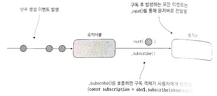 옵저버블을 통해 방출되고 처리되는 모든 데이터에는 목적지가 필요하다. 옵저버는 구독 컨텍스트 안에서 만들어지는데, 이는 옵저버블 소스에서 subscribe()를 호출한 결과가 Subscription 객체임을 의미한다. 옵저버블은 동기 또는 비동기로 작동하므로 옵저버블의 소비자는 콜백과 함께 발생되는 제어의 역전을 어떤 식으로든 지원해야 한다. 옵저버블은 옵저버의 next() 함수로 더 많은 데이터를 사용할 수 있음을 옵저버 구조에 신호를 보내거나 호출해야 한다.