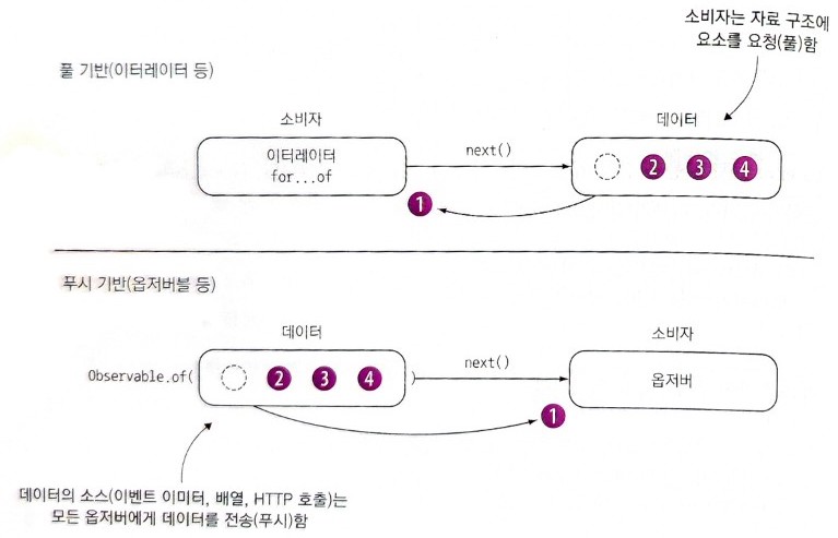 풀 기반 패러다임은 연산에서 값을 즉시 반환할 수 있음을 알고 있을 때 유용하다. 하지만 소비자가 다음 데이터를 언제 사용할지 알 수 없는 마우스 클릭 같은 시나리오에서는 취약하다. 이러한 이유로 푸시 기반인 비동기에 해당하는 타입이 필요하다. RxJS 옵저버블은 푸시 기반 알림을 사용한다. 데이터를 요청하지 않으며 데이터가 옵저버블에 전달되어 옵저버블이 반응하는 식이다.