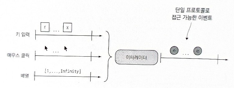 - 비동기, 다중 값 : 이터레이터와 Promise 패턴의 의미가 혼합되어야 한다. 일반적으로 EventEmitter를 사용하는데, 클로저가 전달될 수 있는 훅 또는 콜백을 제공하기 때문이다.