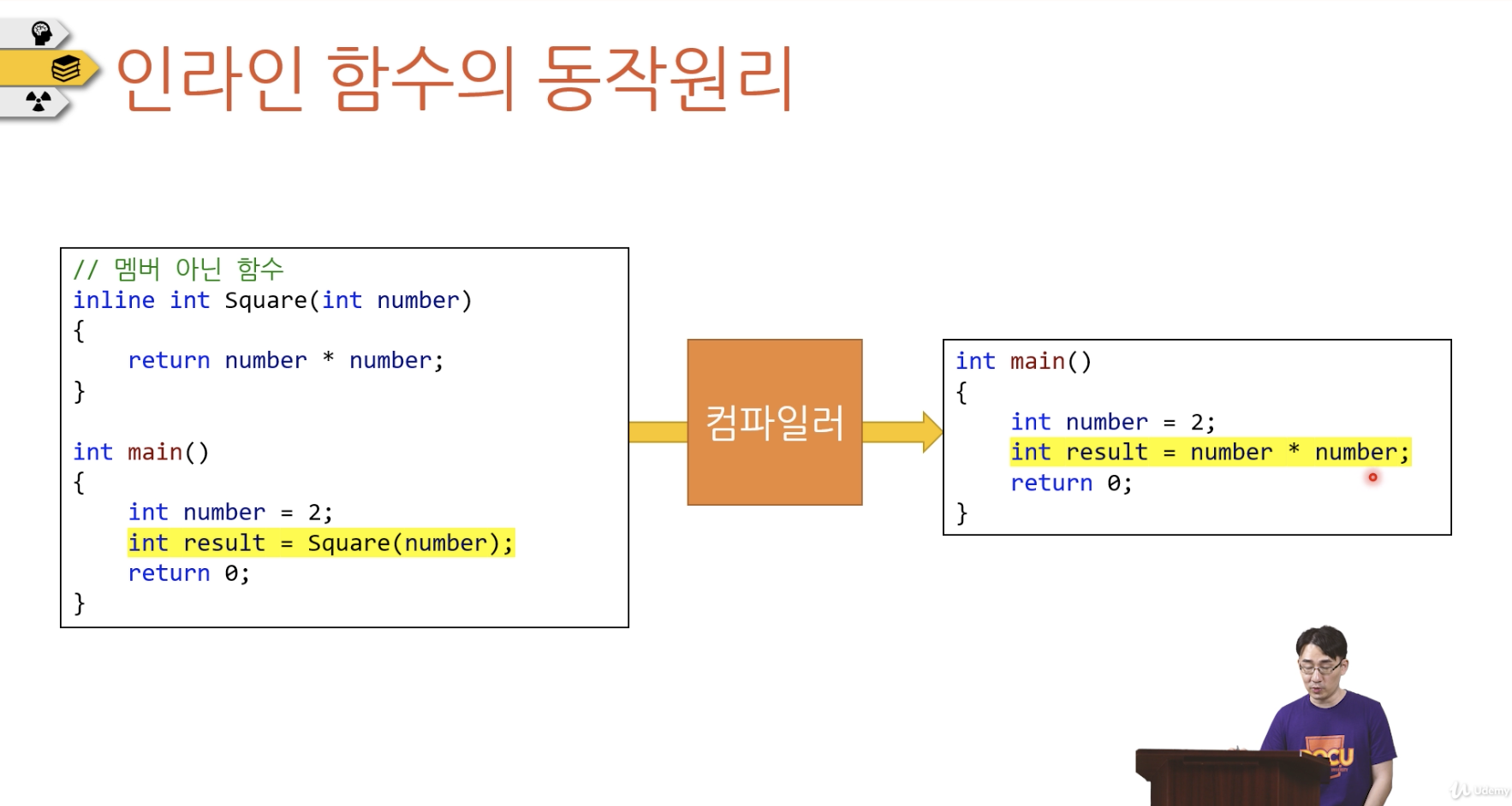인라인 함수는 복붙과 사실 비슷하다. 컴파일 하는 도중에 함수를 가져다 준다는 점에서 매크로와 조금 다르다. 매크로를 그냥 써도 되지 않을까? 라고 생각할 수 있겠지만, 매크로는 디버깅하기가 어렵고 범위(scope)를 준수하지 않아서 가능하면 인라인 함수를 쓰는 것을 권장한다.