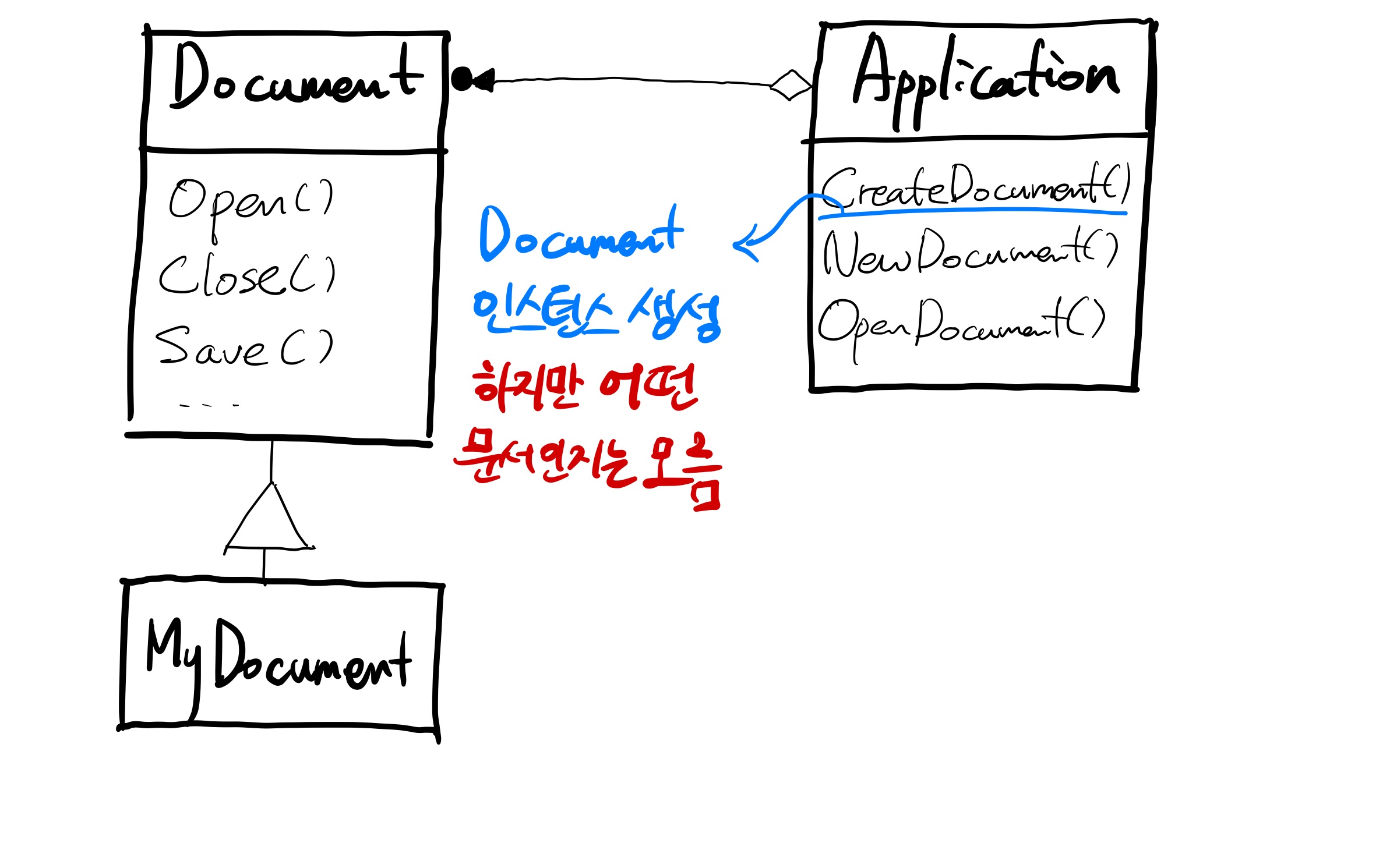 - ConcreteProduct (MyDocument) : product 클래스에 정의된 인터페이스를 실제로 구현한다.