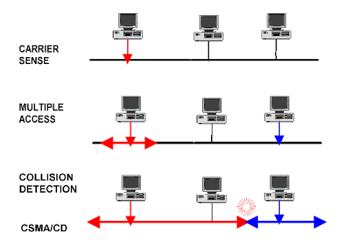 CSMA/CD 방식에 대해서 조금 더 설명을 하면, Carrier Sense Multiple Access/Collision Detection의 약자이다. 이더넷 환경에서 통신을 하고 싶은 PC나 서버는 현재 네트워크 상에서 통신이 일어나고 있는지를 확인해야 한다. 네트워크 상에 있는 신호를 캐리어(Carrier)라고 하는데, 이 신호를 감지하는 것이 Carrier Sense이다. 네트워크 상에서 캐리어가 감지되면 기다리고, 캐리어가 없으면 자기 데이터를 네트워크에 실어서 보낸다. 이 경우 두 개 이상의 PC나 서버가 동시에 데이터를 네트워크에 실어서 보낼 수도 있는데 이를 Multiple Access, 즉 다중접근 이라고 한다.