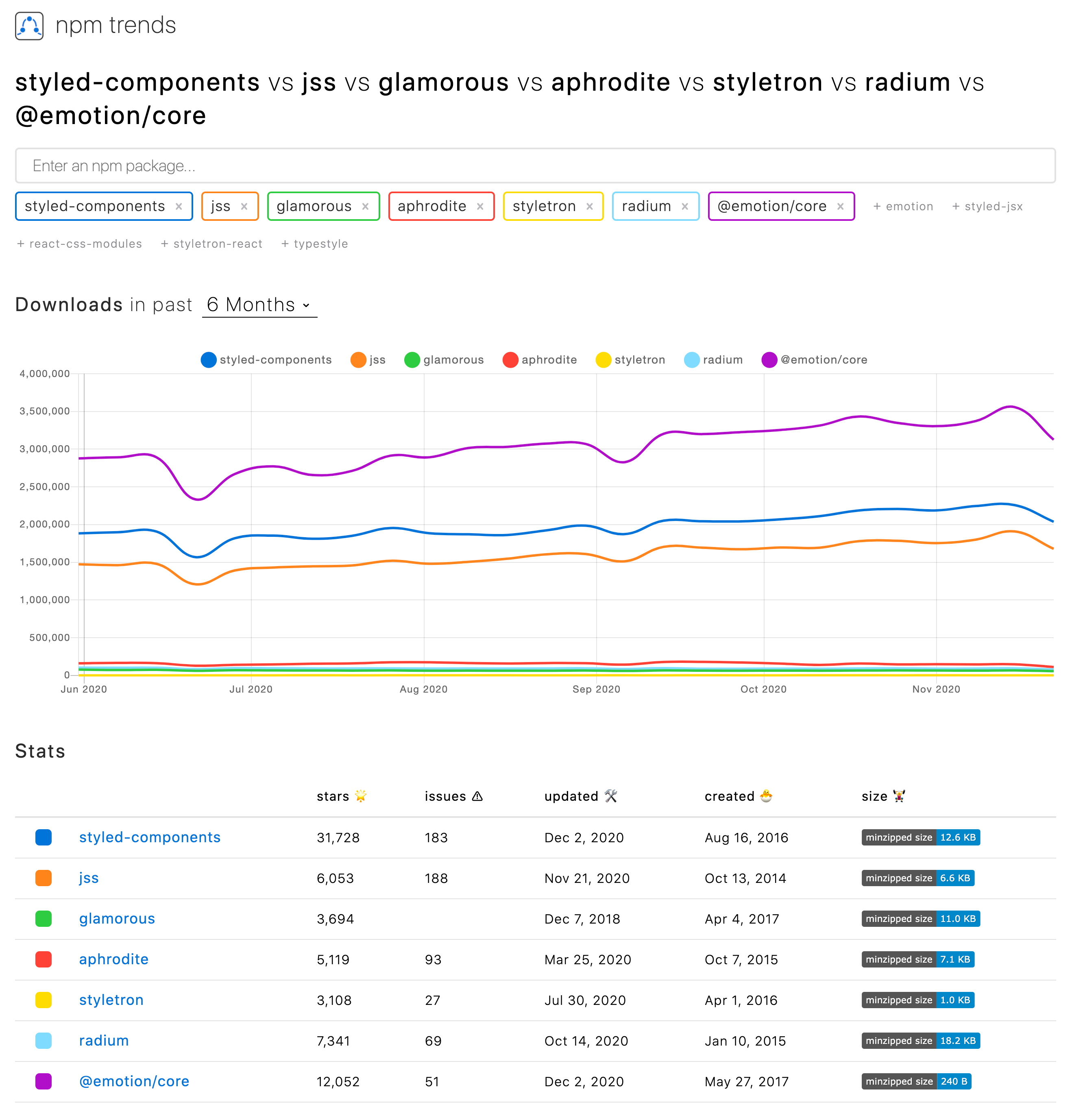 현재 사용되고 있는 CSS-in-JS 라이브러리에는 다음과 같은 것들이 있다. (2020년 12월 기준)
