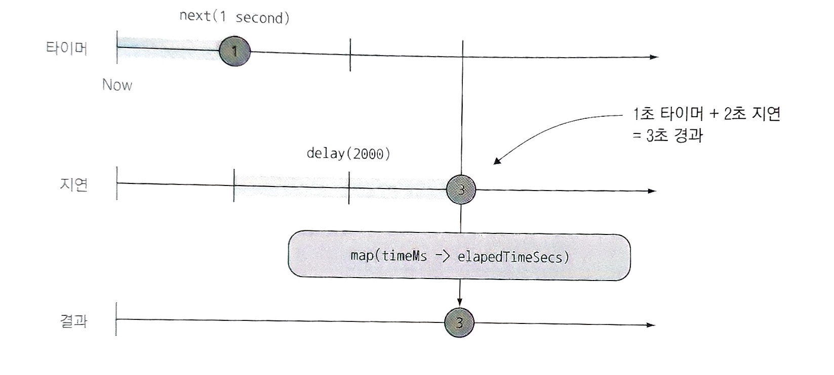 명시적 타이밍과 암시적 타이밍은 상호 배타적이지는 않다. 하지만 이 둘을 함께 사용하려면 시간이 다운스트림 연산자에 전파되는 방식을 이해해야 한다. 명시적 타이밍의 경우 순서와 관련된 문제가 생길 수 있다. 예를 들면 delay() 연산자를 도입할 때를 생각해 보자. 이벤트가 delay() 1초 후에 도착하고 지연이 2초라면 이벤트는 3초 후 구독 메서드로 방출된다. 이를 다이어그램으로 나타내면 다음과 같다.